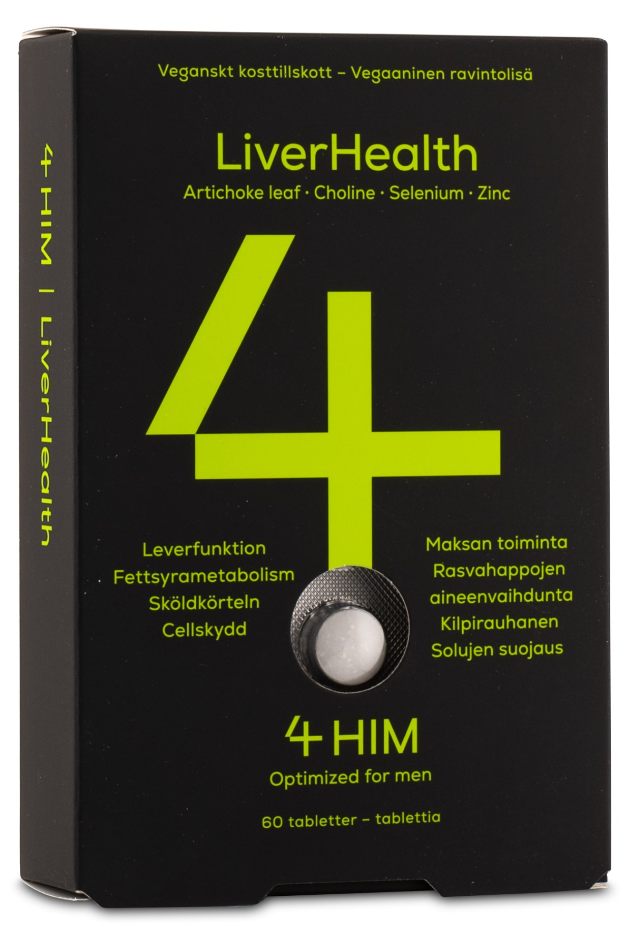 4HIM LiverHealth är ett kosttillskott speciellt anpassat för män. Det innehåller kolin, zink, selen och vitamin E, C och B6 samt kronärtskocksbladextrakt. Kolin stödjer normal leverfunktion och fettomsättning. Zink bidrar till normal metabolism av fettsyror, samt skyddar cellerna mot oxidativ stress tillsammans med vitamin E och C. Vitamin B6 främjar normal protein- och glykogenmetabolism, medan selen bidrar till normal sköldkörtelfunktion.
