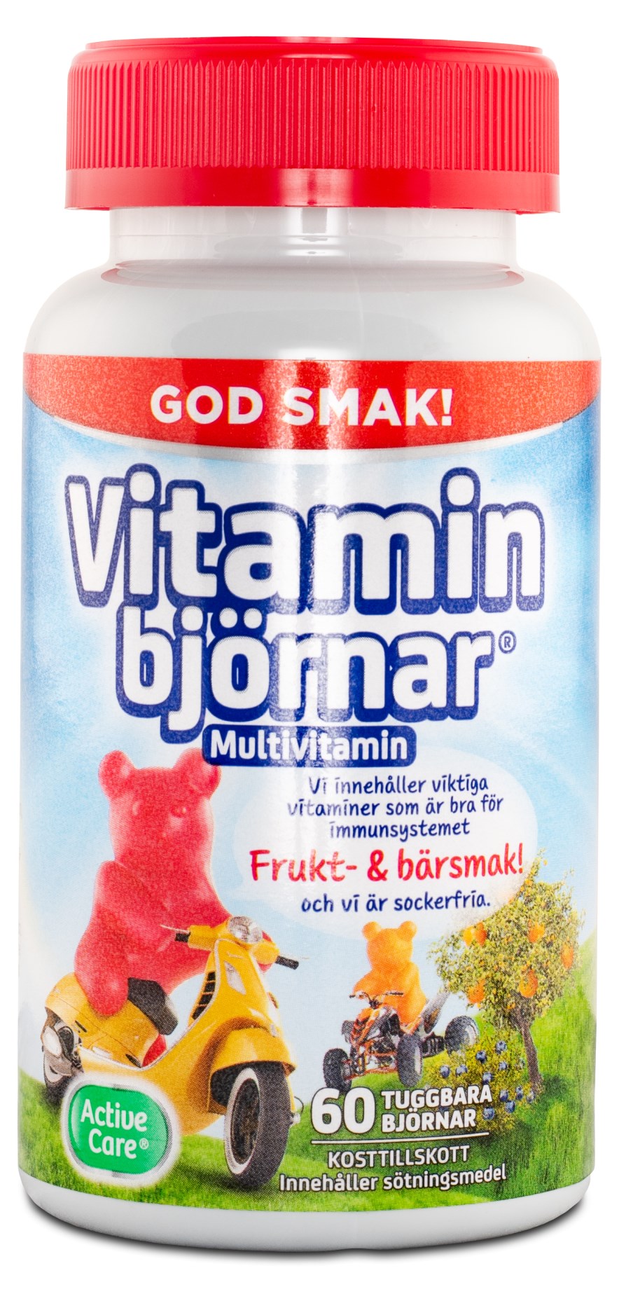 Active Care Vitaminbjörnar är ett allsidigt komplement av vitaminer till den dagliga kosten. Vitaminbjörnar gör det enklare att ta vitaminer dagligen, både för att du inte glömmer dem och för att de smakar gott. Det är viktigt för alla att få i sig de näringsämnen man behöver varje dag. Vitaminbjörnar hjälper dig på vägen.