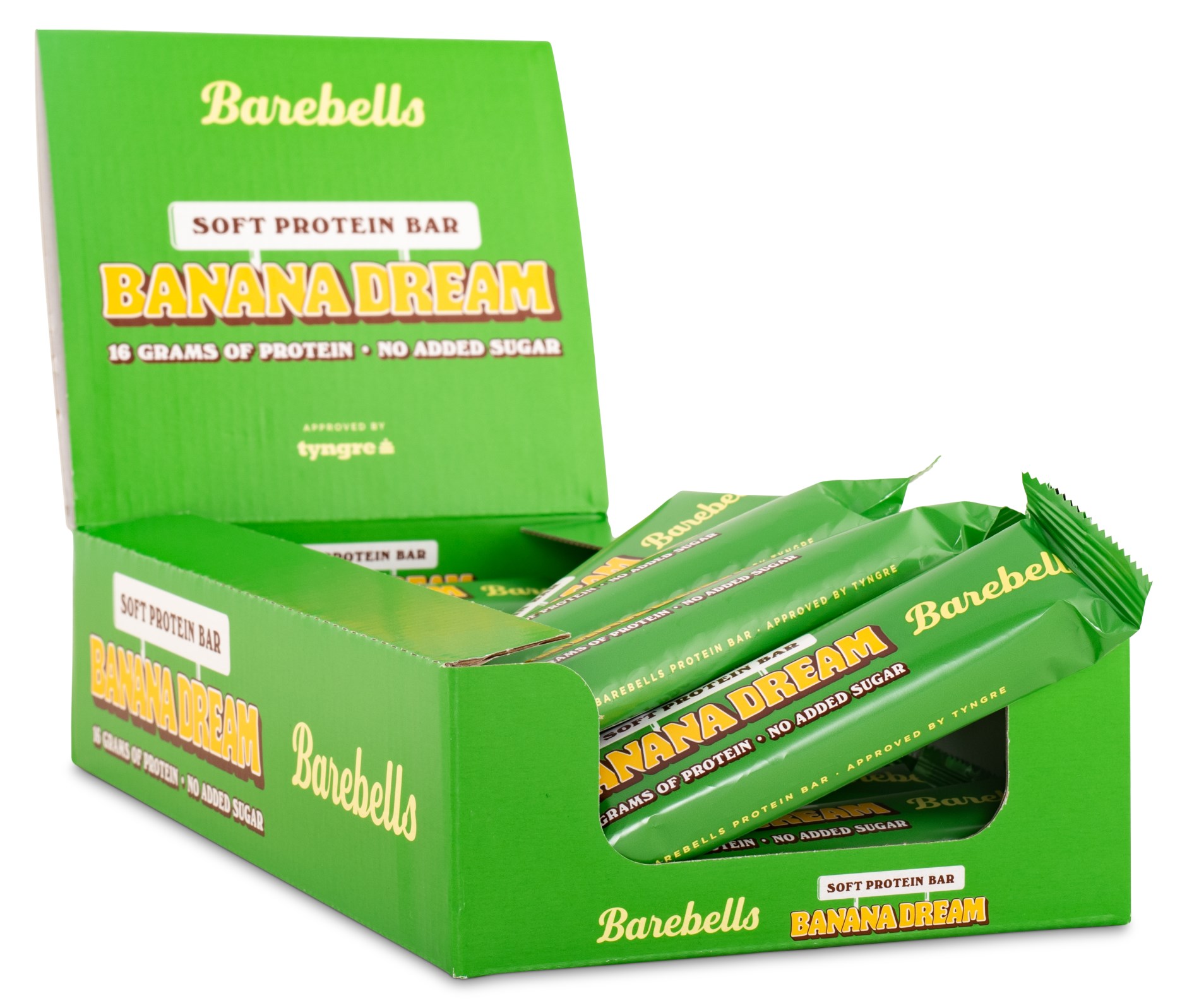 Barebells Soft Protein Bar Banana Dream – Består av en mjuk kärna med banansmak toppad med kolasås och silkeslen mjölkchoklad.