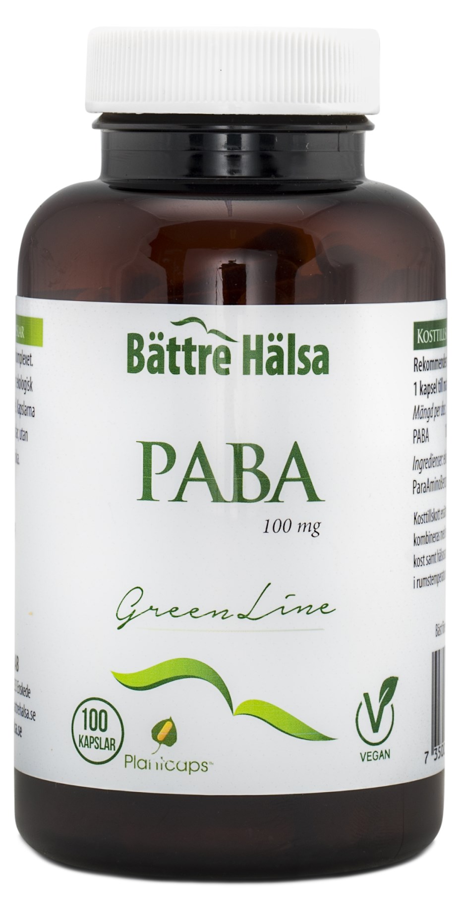 Bättre Hälsa PABA Green Line är ett veganskt kosttillskott från växtriket. PABA eller paraaminobensoesyra som det även kallas, är ett vitaminliknande ämne som ingår i kroppens proteinomsättning med hjälp av kroppens egna tarmbakterier. Ämnet bidrar även till bildandet av röda blodkroppar som i sin tur stödjer och stimulerar tarmfloran i bildandet av folsyra. Bättre Hälsa PABA Green Line innehåller endast vegetabiliska ingredienser från växtriket och är därför helt vegansk.
