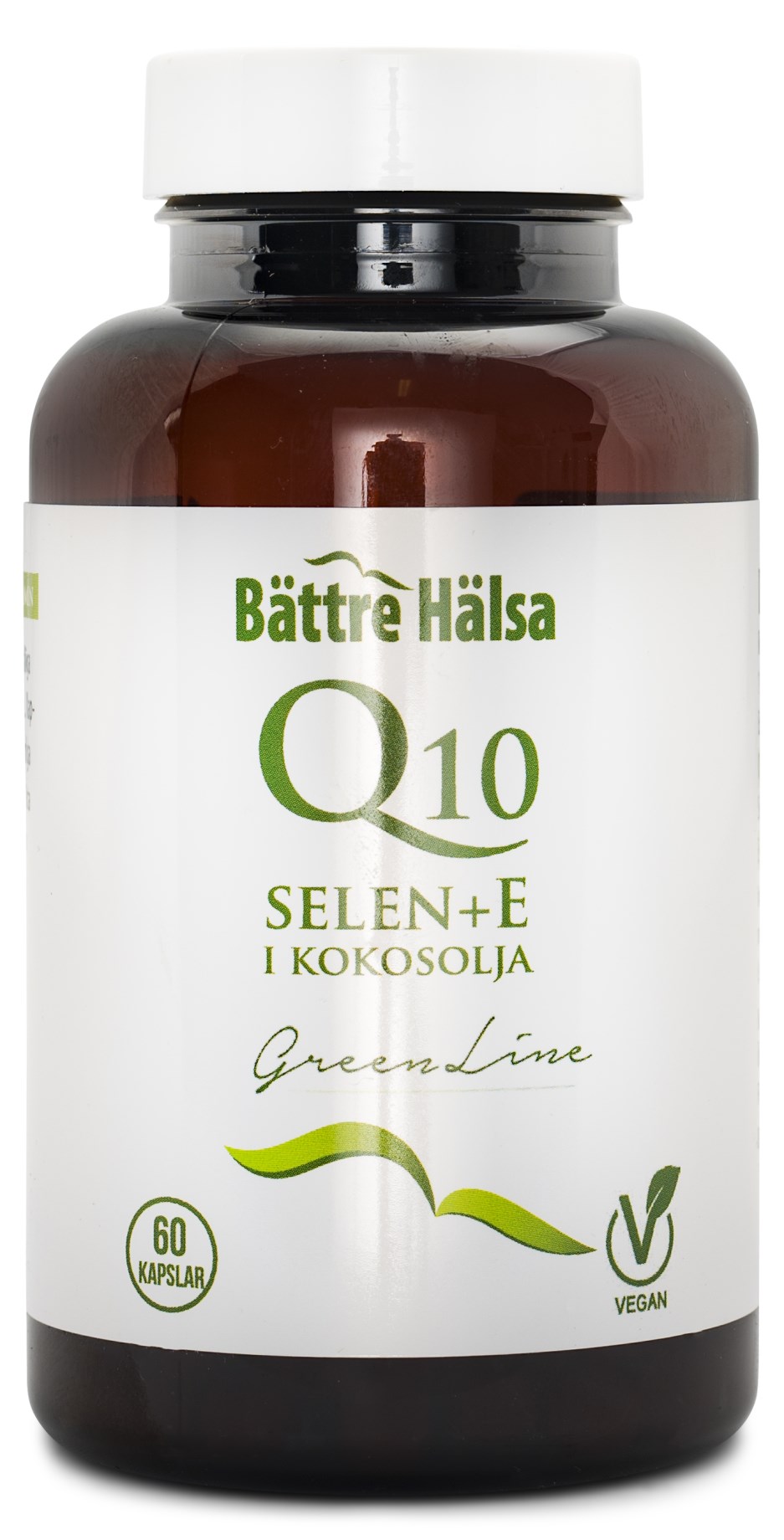 Kombinationstillskottet Q10+Selen+E från Bättre Hälsas Green Line, är utvecklad för dig som vill ha det lilla extra. Q10 är ett naturligt ämne som förekommer i kroppens stora, viktiga organ såsom hjärta och hjärna. Vitamin E tillsammans med Q10 fungerar som en antioxidant i kroppen och hjälper till att motverka oxidativ stress i cellerna, men dessvärre minskar produktionen Q10 i kroppen ju äldre vi blir. Detta kosttillskott kombinerar Q10 med selen och vitamin E, och dessutom är kokosolja tillsatt för bästa upptag. Kapslarna är vegetabiliska och fria från onödiga bindemedel - helt enligt signumet för Green Line.