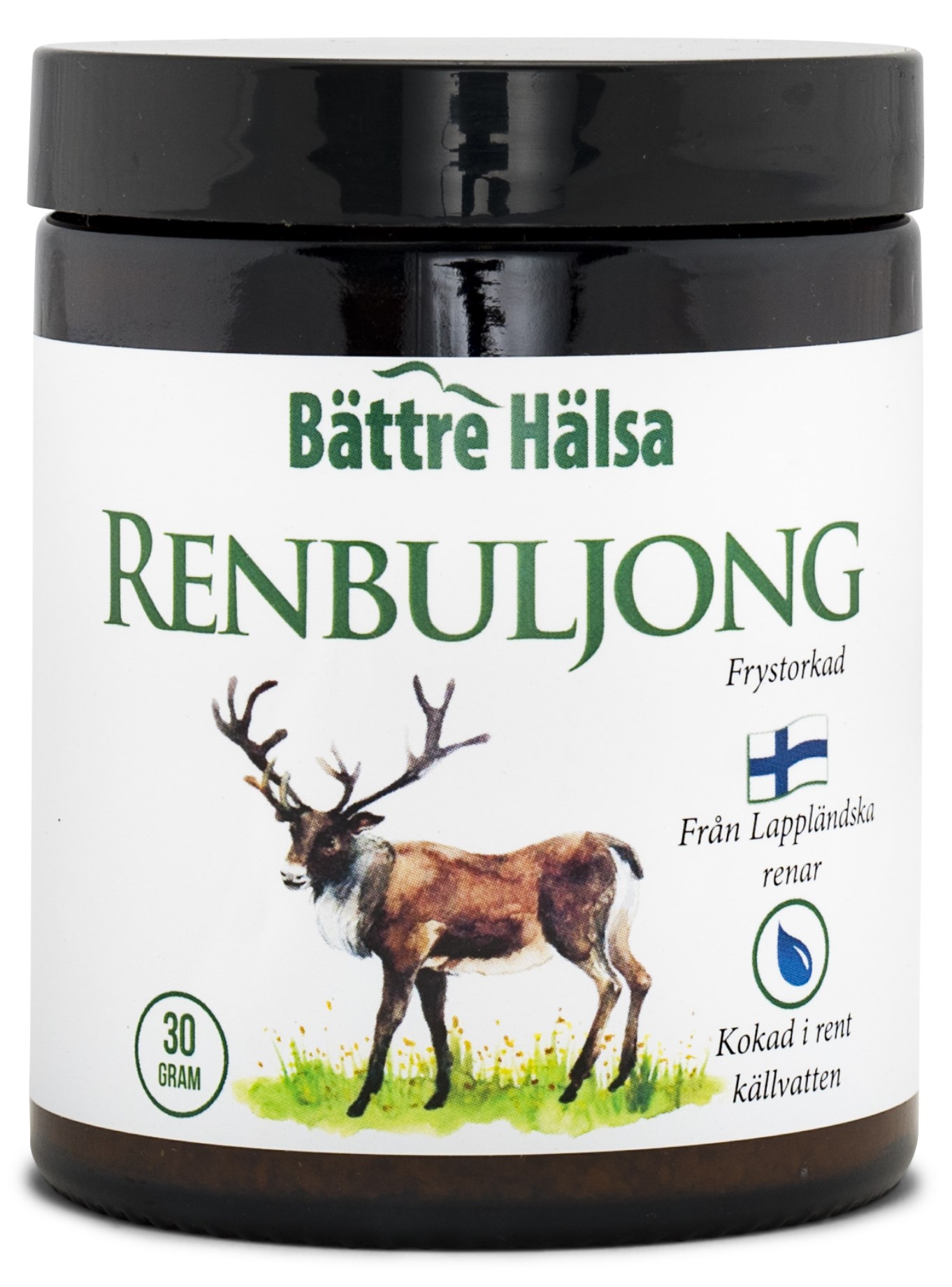 Bättre Hälsa Renbuljong tillverkas av ben och benmärg från renar i finska Lappland som sedan får koka i finskt källvatten i 24 timmar. Efter det frystorkas buljongen vilken gör att all näring bevaras. Buljongen är en naturlig källa till bland annat kollagen, hyaluronsyra och olika aminosyror. Bättre Hälsa Renbuljong kan användas som bas i olika soppor och grytor men också för sina hälsofrämjande egenskaper. Du kan också ta den som den är i ett glas varmt vatten.