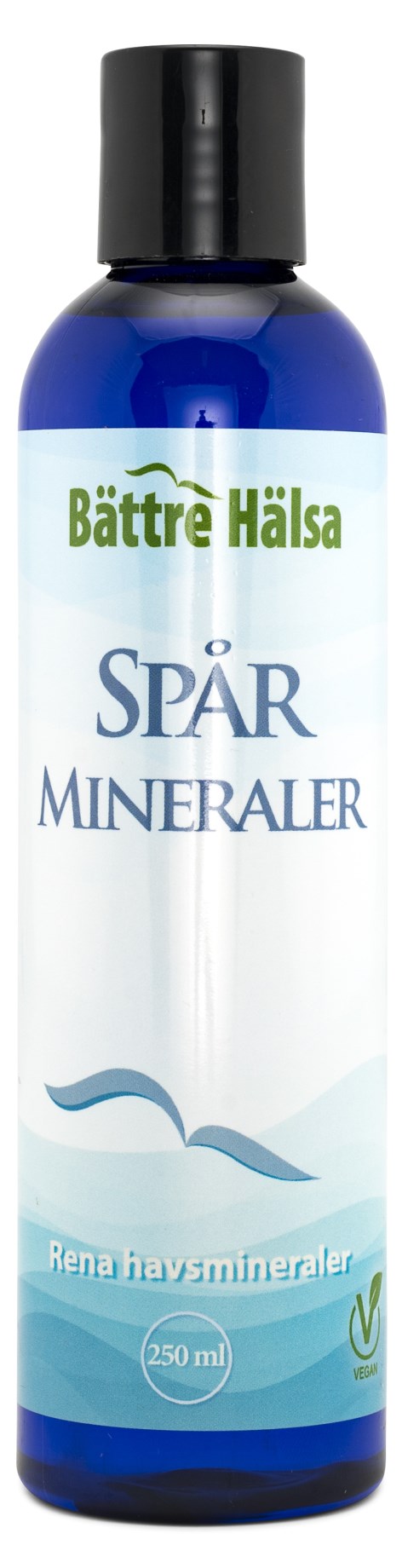 Bättre Hälsa Spårmineraler är ett koncentrerat mineraltillskott i flytande form. Häll det i ditt vatten för att göra det närings- och mineralrikt. Tillskottet har en stor mängd joniska havsmineraler, en hög halt magnesium samt över 70 andra spårmineraler såsom zink, jod, mangan och koppar. Det kommer från det mineralrika havet utanför Australiens sydkust, där samlas havsvattnet in i dammar som sedan evaporeras under solen. Kvar lämnas en koncentrerad och ren jonisk havsminerallösning. Mineralerna reduceras till sitt ursprungliga tillstånd och alla föroreningar tas bort. De testas även noggrant innan de förpackas.