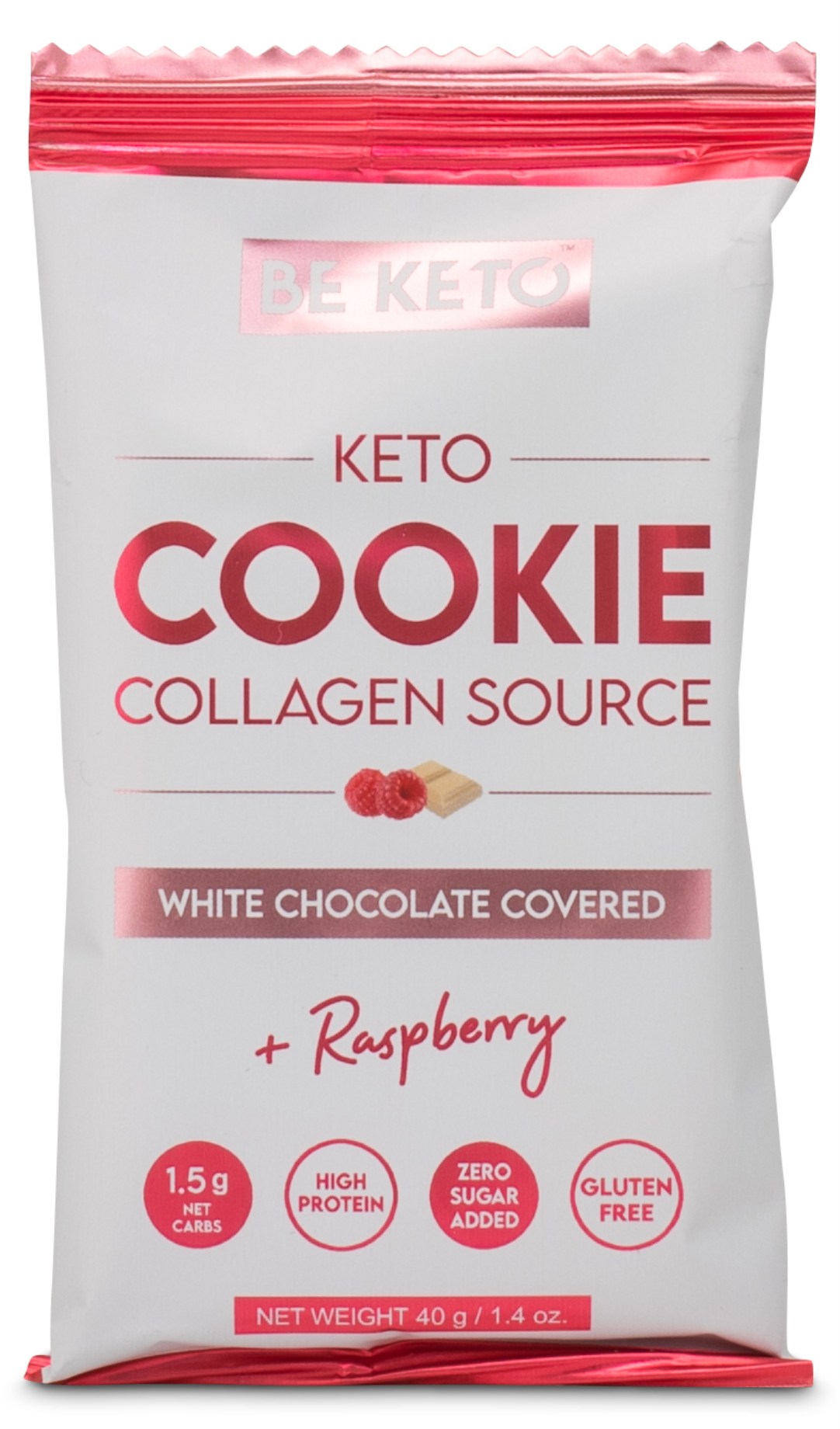 Keto Cookie White Chocolate & Raspberry – knaprig och söt med ett lent överdrag av vit choklad och frystorkade hallon. Berikad med kollagen.
