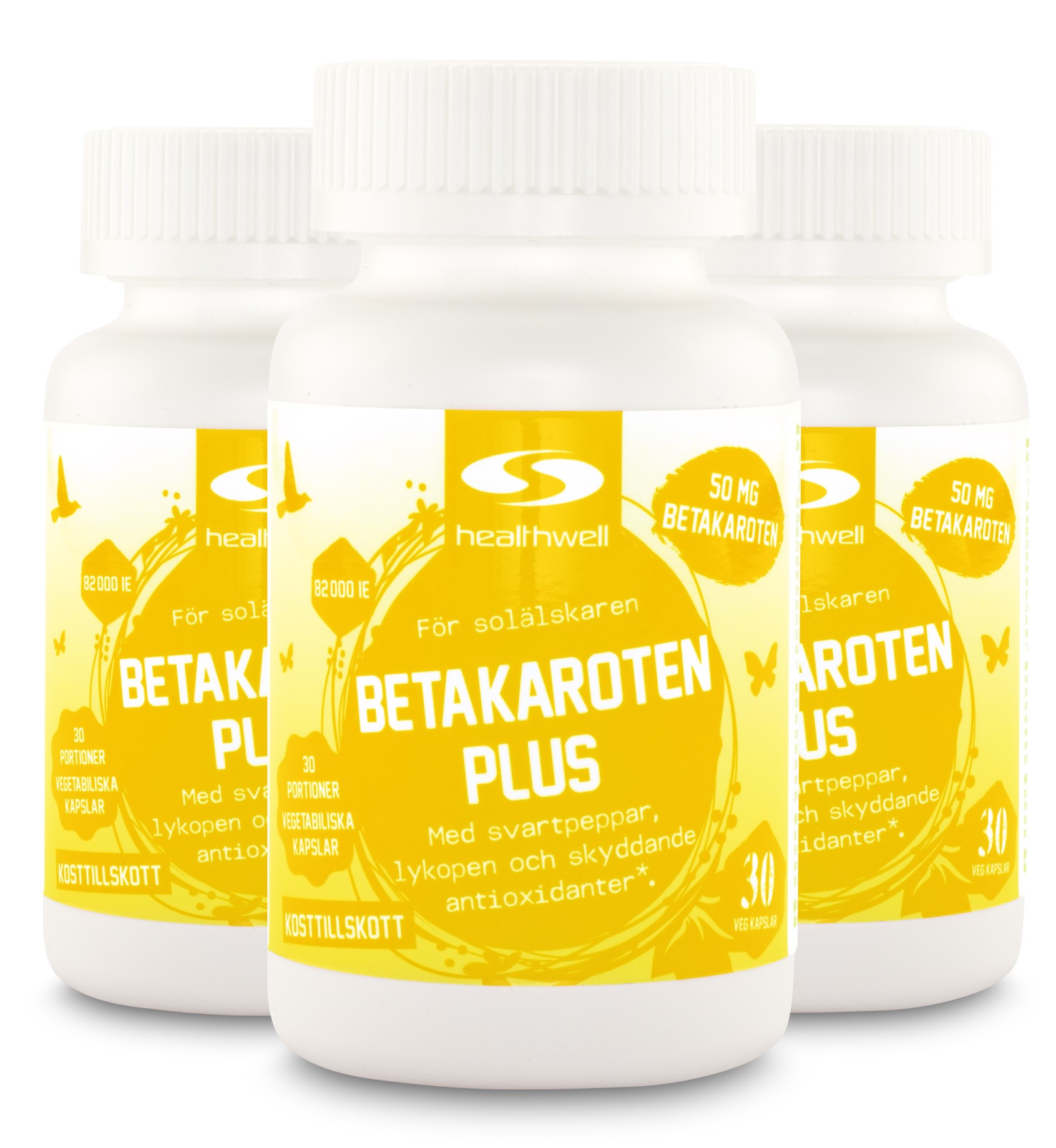 Healthwell Betakaroten Plus är skapad med fokus på att maximera effekten av en redan hög mängd betakaroten. En kapsel innehåller 82 000 IE, vilket motsvarar 50 milligram betakaroten. Genom att tillsätta piperin från svartpepparextrakt har man lyckats öka biotillgängligheten på betakarotenet, piperin har nämligen visats sig kunna ge upp till 2000 % bättre upptagningsförmåga. I kapslarna finns även tillsatt solrosolja som gör att betakaroten kan tas upp i kroppen optimalt, betakaroten är nämligen ett fettlösligt ämne. Betakaroten Plus innehåller även lykopen och flera vitaminer och mineraler där vissa av dem även fungerar som skyddande antioxidanter.
