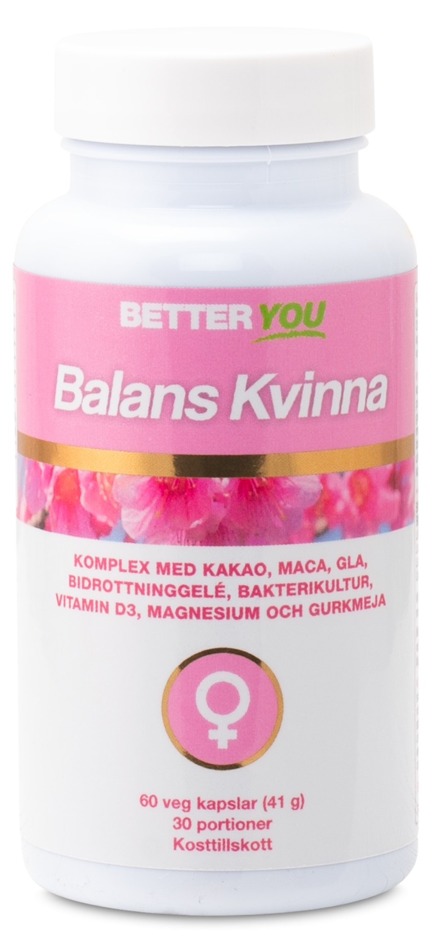 Better You Balans Kvinna är ett tillskott med väl utvalda ingredienser för att passa den medvetna och moderna kvinnan. Balans Kvinna innehåller bland annat D-vitamin som bidrar till att bibehålla en normal muskelfunktion och benstomme, samt magnesium för psykologisk funktion. Macapulver från macaroten är rik på flera mineraler såsom zink, selen, järn och kalium som alla är till fördel för kroppens funktioner och välmående, specifikt för kvinnan som är i övergångsåldern. Förutom viktiga vitaminer och mineraler innehåller kapslarna flera populära ämnen som rå kakao, bidrottninggelé, gurkmejaextrakt, broccoliextrakt och resveratrol samt jättenattljusolja som blivit allt mer uppmärksammat i samband med klimakteriebesvär. Kapslarna är ger dig balans inifrån och ut i en stressig vardag full med bestyr.