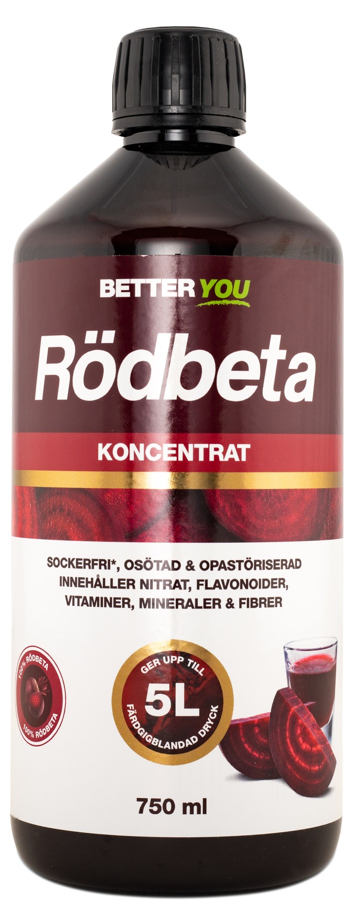 Better You Rödbetskoncentrat är ett juicekoncentrat på 100 % rödbeta. Den är outspädd och opastöriserad samt fri från tillsatt socker och sötningsmedel. Rödbetor är naturligt rika på nitrat, fibrer, vitaminer och mineraler. Nitrat är ett ämne som bidrar till kroppens produktion av kväveoxid. Passar som måltidsdryck och ska då spädas med 1 del koncentrat samt 6 delar vatten. Better You Rödbetskoncentrat ger upp till 5 liter färdigblandad dryck.