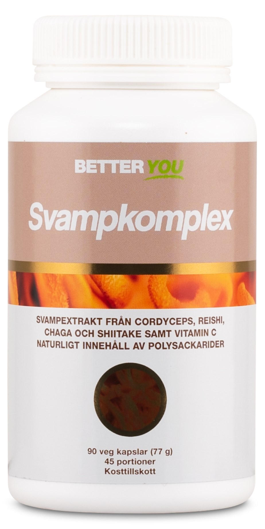 Better You Svampkomplex är en kombination av fyra populära svampar: cordyceps, reishi, chaga och shiitake. Dessa svampar är kända för sina hälsofördelar inom naturmedel. Komplexet innehåller också C-vitamin för att stödja immunsystemets normala funktion. Svamparna i komplexet är naturliga adaptogener och har ett högt ORAC-värde, vilket indikerar deras höga antioxidantinnehåll. Adaptogener är växter som innehåller ämnen som hjälper kroppen att anpassa sig till utmanande förhållanden och motverka skador som kan uppstå till följd av dessa påfrestningar.