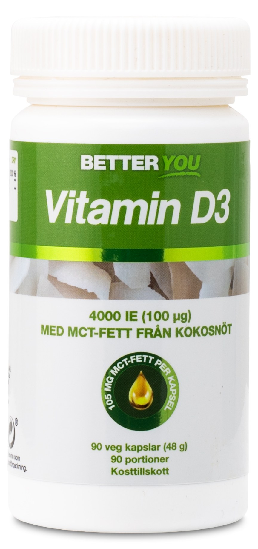 Vitamin D är ett av vår tids mest omtalade vitamin, och det beror på att man upptäckt att många av oss i Sverige har svårt att få i oss detta vitamin, speciellt under vinterhalvåret om vi inte äter tillräckligt med fet fisk. Vår främsta källa till D-vitamin är nämligen från solens strålar, som med hjälp av bland annat kolesterol bildar vitaminet under huden. D-vitamin bidrar bland annat till ett normalt immunsystem samt till kalciumupptaget i kroppen. Better Yous D-vitamin kommer från naturliga källor och innehåller kolekalciferol, D3-vitamin, som är den form av vitaminet som bäst motsvarar det vitamin vi får från solen. En tablett ger hela 4000 IE, och en liten mängd kokosolja är tillsatt för bästa upptag, då D-vitamin är ett fettlösligt vitamin.