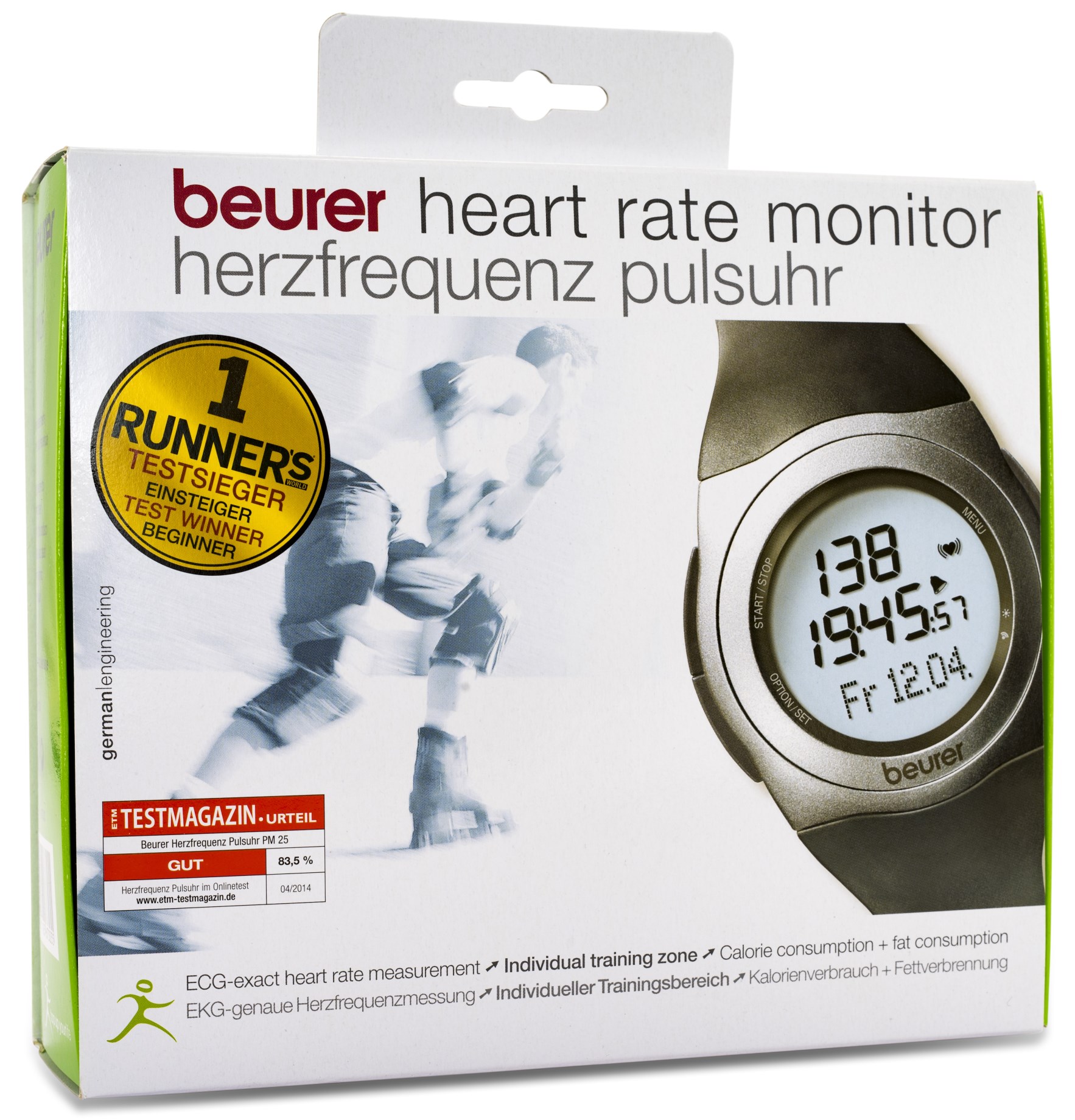 Pulsmätare PM25 från Beurer är en mångfunktionell och prisvärd klocka som enkelt mäter din puls. Genom att använda Pulsmätare PM25 får du stenkoll på din träning och kan på ett enkelt sätt mäta dina framsteg. Pulsklockan har flera funktioner såsom maxpuls, kalori- och fettförbrukning samt alarmklocka och stoppur. Tack vare dess många funktioner så passar klockan både till dig som är en van idrottare som till dig som är nybörjare. Klockan har blivit prisbelönt i tidningen Runner´s world och den står sig bra i tester när den jämförs med andra pulsklockor. Med denna pulsmätare kan du på ett enkelt sätt få koll på konditionsträningen, fäst bara pulsbandet runt bröstkorgen och sen är det bara att ge sig ut på en löprunda.