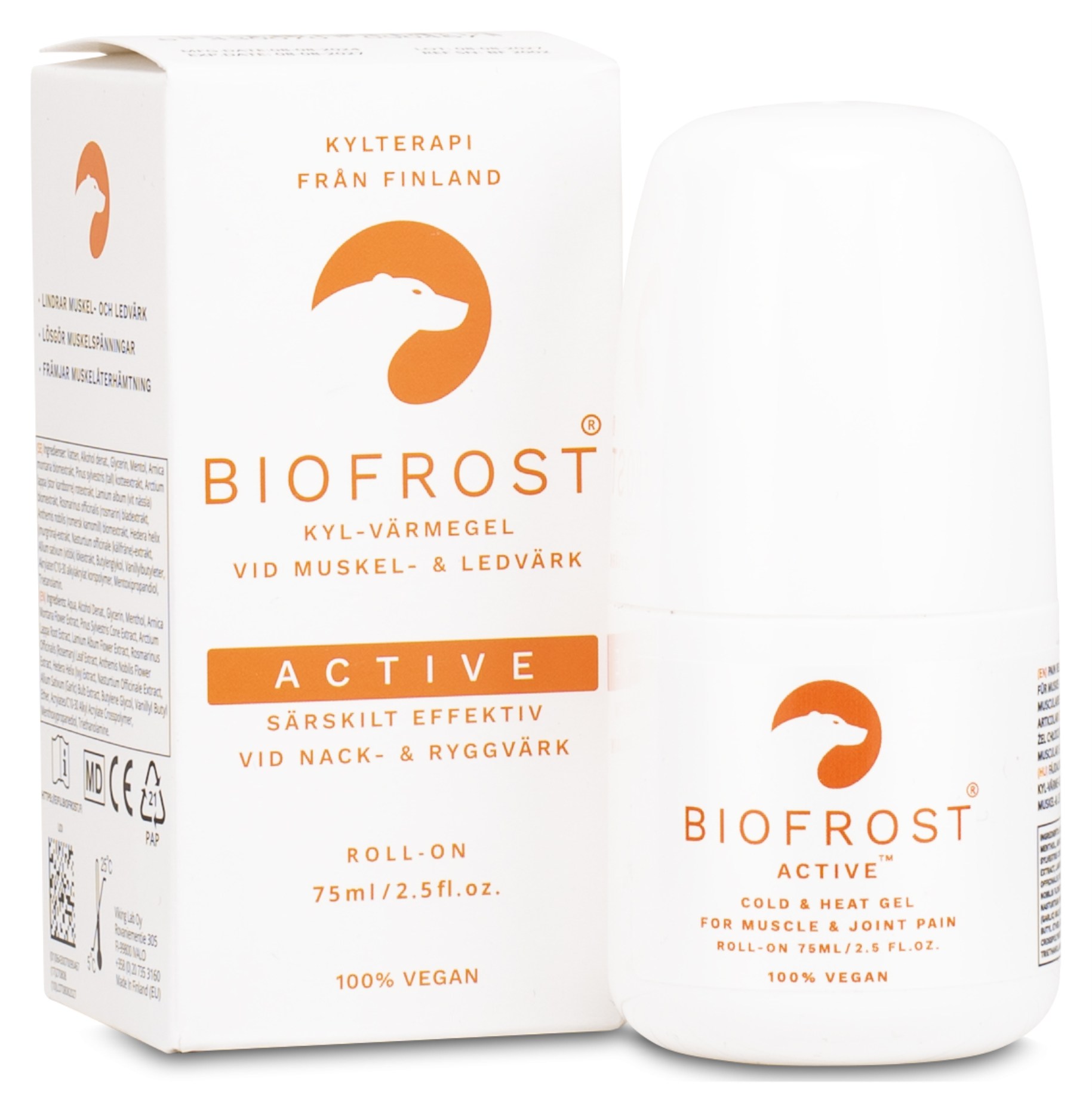 Biofrost Active Roll-on har en unik dubbelverkande kyla- och värmeverkan som lindrar smärta, bidrar till att muskelspänningar släpper och främjar återhämtning vid rygg- och muskelvärk. En kombination av arnika, kardborre, romersk kamomill, vitlök, vattenkrasse, murgröna, vit nässla, tall, mentol och rosmarin ger en högpresterande effekt. Produkten är utmärkt att använda före träning men även i vardagen – exempelvis efter längre perioder av stillasittande när snabb lindring önskas.