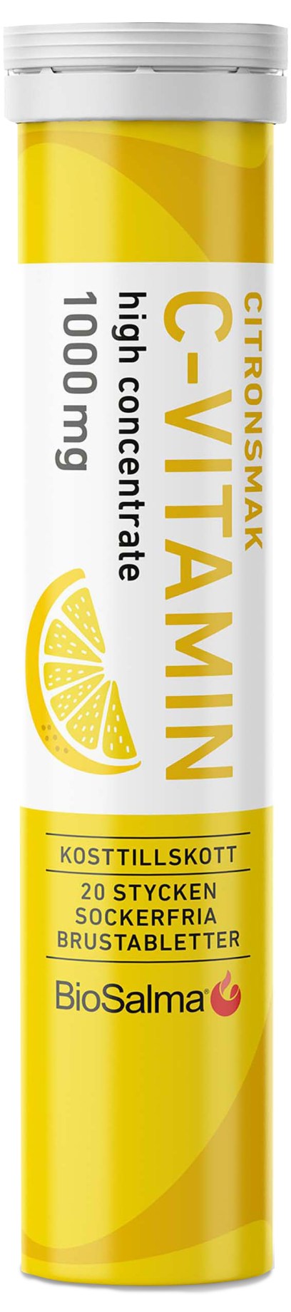 BioSalma C-vitamin 1000 mg innehåller 100 mg C-vitamin per tablett. Vitamin C bidrar till att minska trötthet och utmattning och till ett normalt fungerande immunsystem. Ta en tablett dagligen och lös upp i vatten för en extra boost.
