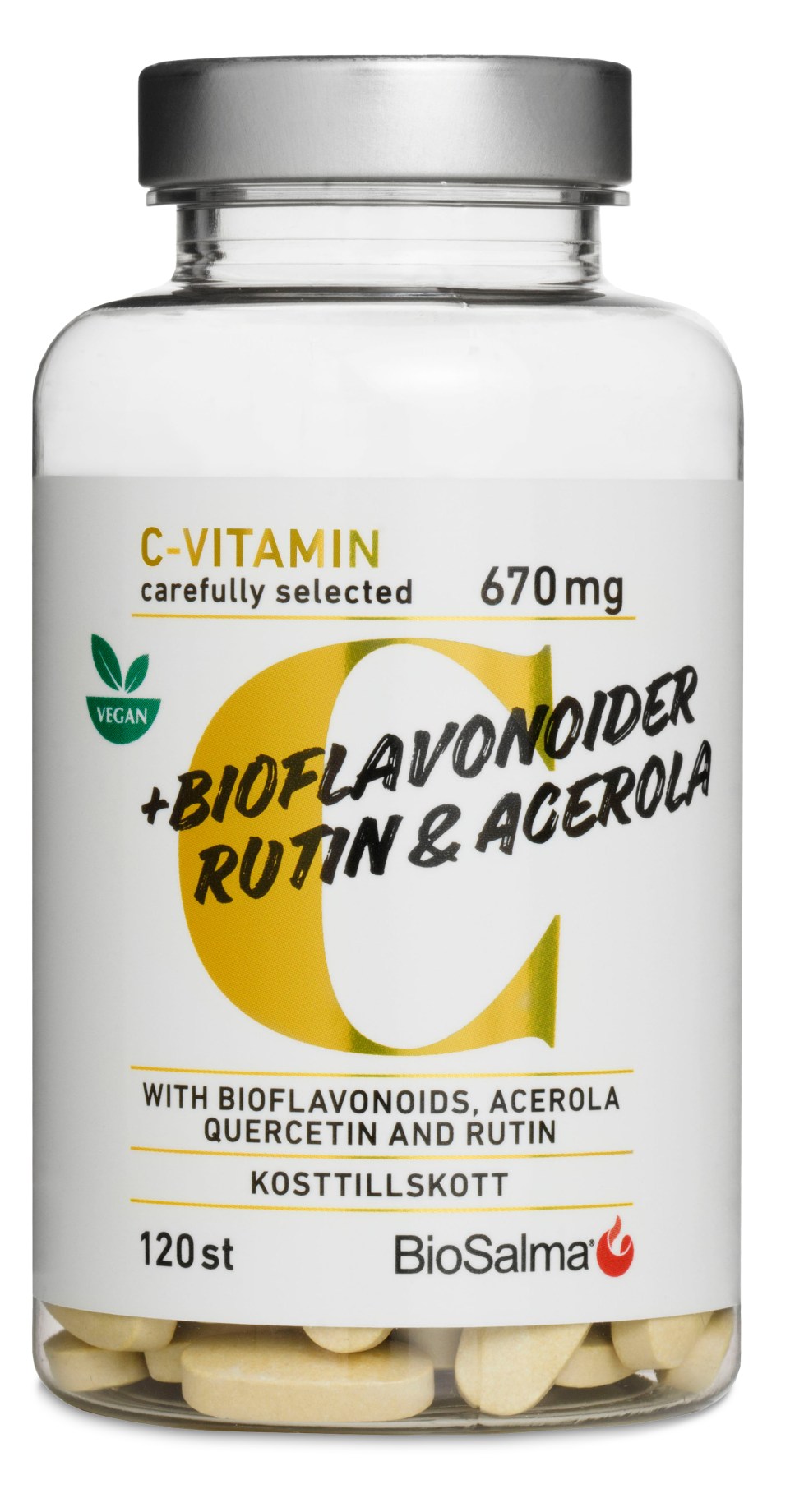 BioSalma C-vitamin 670mg + Bioflavonoider ger dig en optimal kombination av vitamin C och bioflavonoider. Vitaminet löses upp successivt under dagen i en så kallad “time release”. Vitamin C bidrar till ett normalt fungerande immunsystem och till att minska trötthet och utmattning. Med bioflavonoider från citrusfrukt, rutin och quercetin från pagodträd.