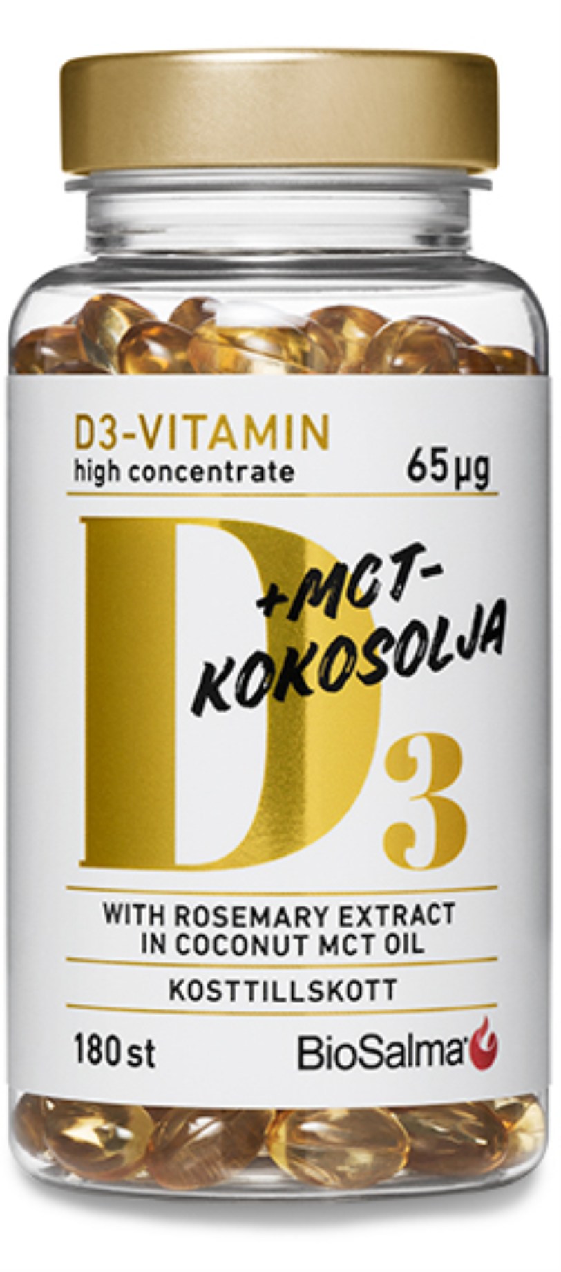 BioSalma D3-vitamin 65 ug MCT-kokosolja innehåller D-vitamin i små kapslar som gör det lättare att svälja. D-vitaminet är löst i mellanlånga fettsyror från kokosnöt (MCT – kokosolja) då det förbättrar upptaget av vitaminet som är fettlösligt. D-vitamin bidrar till att upprätthålla normal benstomme och till immunsystemets normala funktion.
