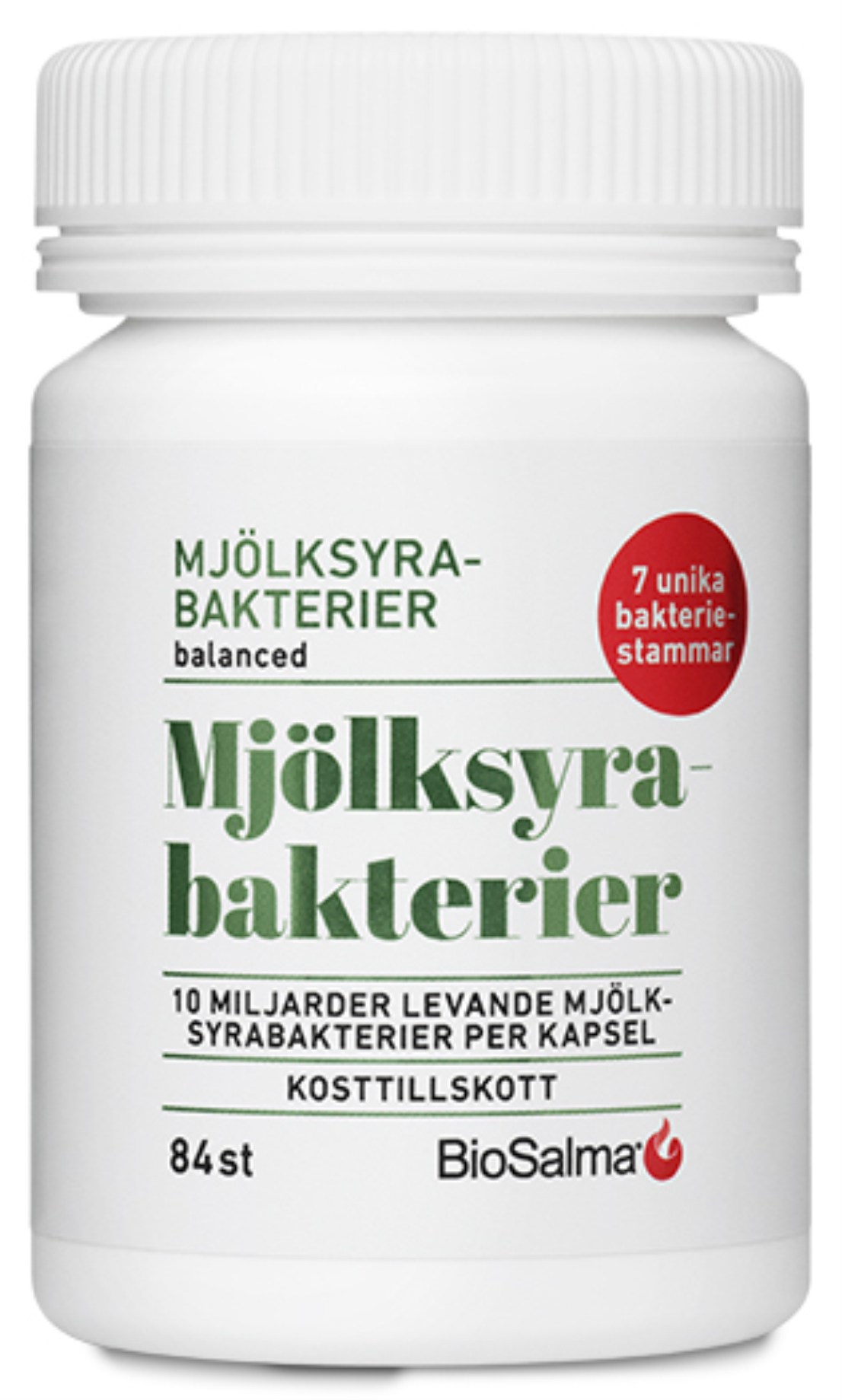 I BioSalma Mjölksyrabakterier 7 stammar får du 10 miljarder mjölksyrabakterier i varje kapsel som kommer från sju noggrant utvalda stammar. Mjölksyrabakterier finns naturligt i kroppen och i till exempel yoghurt, kimchi, surkål och andra fermenterade livsmedel. Kapselskalet är magsyraresistent så att mjölksyrabakterierna kan passera genom magsäcken och ända till tunntarmen utan att de påverkas av magsyran.