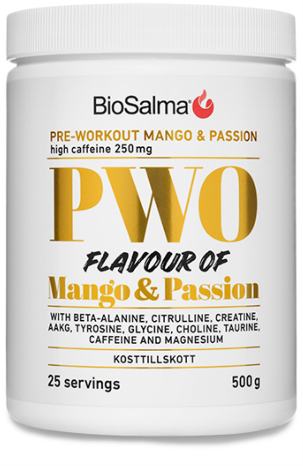 Ladda upp inför träningen med BioSalma PWO – en noga framtagen pre-workout med maxad dos koffein, elektrolyter, aminosyror och kreatin. Kreatin ökar den fysiska prestationsförmågan vid kortvarig och högintensiv träning. Tillskottet innehåller en hög dos koffein, 250 mg per portion, vilket säkerligen piggar upp inför tuffa träningspass. Välj mellan två goda och fruktiga smaker.