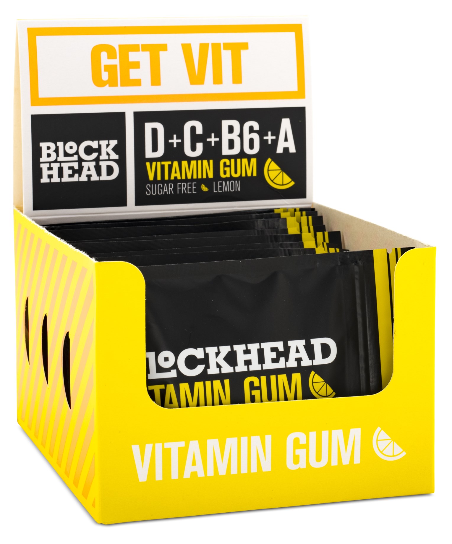 BLOCKHEAD Vitamin Gum är ett snabbt, smidigt och gott sätt att tillföra lite extra vitaminer till din vardag. Tuggummit har en god smak av citron och innehåller vitamin D, A, C och B6. Två tuggummin om dagen ger 100 % av dagligt referensintag av alla dessa vitaminer. BLOCKHEAD Vitamin Gum är fri från tillsatt socker, har ett veganskt innehåll och passar perfekt för dig med en aktiv vardag. Varje påse innehåller 10 st tuggummin - varför inte köpa flera påsar och lägga en i väskan, en på jobbet och en hemma?