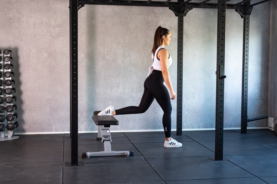 Bulgarian split squat är en skön variant på utfall som sätter balansen på prov. Förutom att övningen ger bra kontakt med främre lår muskulatur och säte, är den perfekt för att träna upp stabiliteten och kontrollen på knä och höft. Övningen är utmanande att göra som den är utan vikter, men behöver du mer utmaning kan du lägga till vikt.