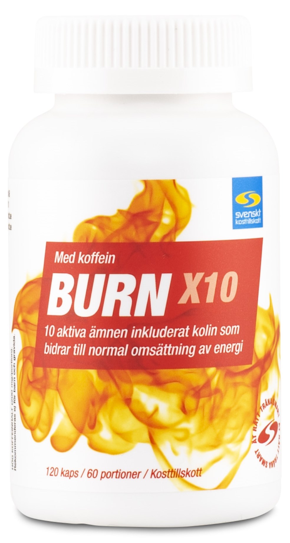 BURN X10 är ett av marknadens mest sålda kosttillskott som används vid perioder då du vill bränna fett. Det innehåller 10 aktiva ämnen inkluderat kolin som bidrar till normal omsättning av energi för att ge dig de resultat du letar efter. Innehållet består av en specialanpassad formula som underlättar för dig som vill öka din prestation, går på diet eller vill säkerställa att din förbränning inte begränsas. BURN X10 bidrar till normal fettomsättning och används med fördel tillsammans med en sund kost och träning. Välj mellan kapslar med eller utan koffein.