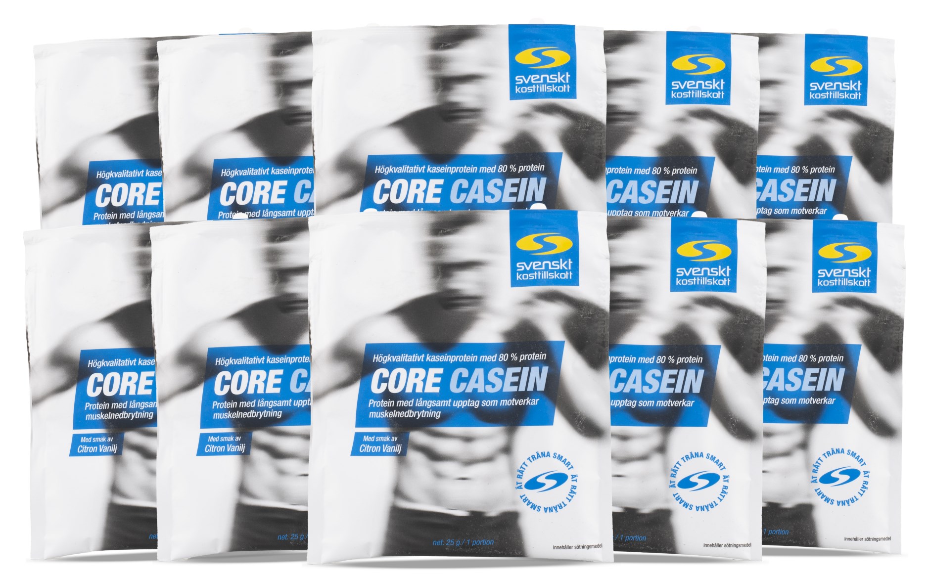 Core Casein Portionspåse ger dig möjlighet att på ett smidigt sätt ta med dig en portion av proteinpulvret Core Casein! Perfekt när du är på språng. Med dessa portionspåsar kan du dessutom prova dig fram till vilken smak som passar dig bäst, utan att behöva köpa en stor påse direkt. Core Casein har ett högt proteininnehåll från mjölkprotein som utsöndras långsamt i kroppen – och ger därför en mättnadskänsla som håller i sig. Dessutom är Core Casein rik på näring och har ett lågt innehåll av laktos. Prova dig fram mellan de fylliga smakerna!