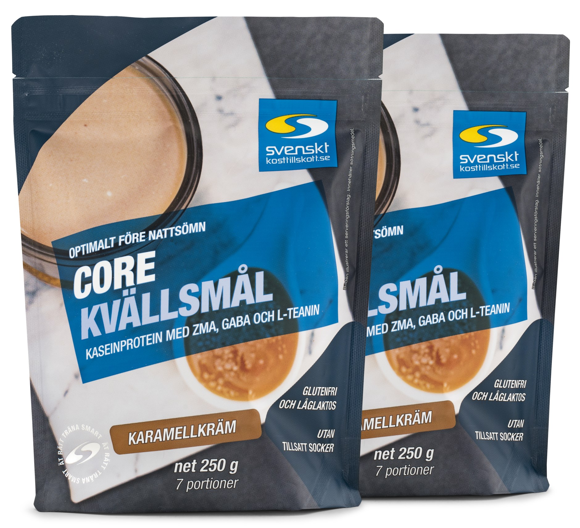 Core Kvällsmål är en optimal måltid före nattsömn, med långsamt kaseinprotein och en mix av GABA, ZMA och L-teanin. Ett perfekt kvällsmål för bästa förutsättningar för en god nattsömn samtidigt som du lätt undviker småätande på kvällen. Core Kvällsmål blandar du enkelt till en god shake som du dricker innan du går och lägger dig, med en härlig smak av chokladpudding eller karamellkräm.