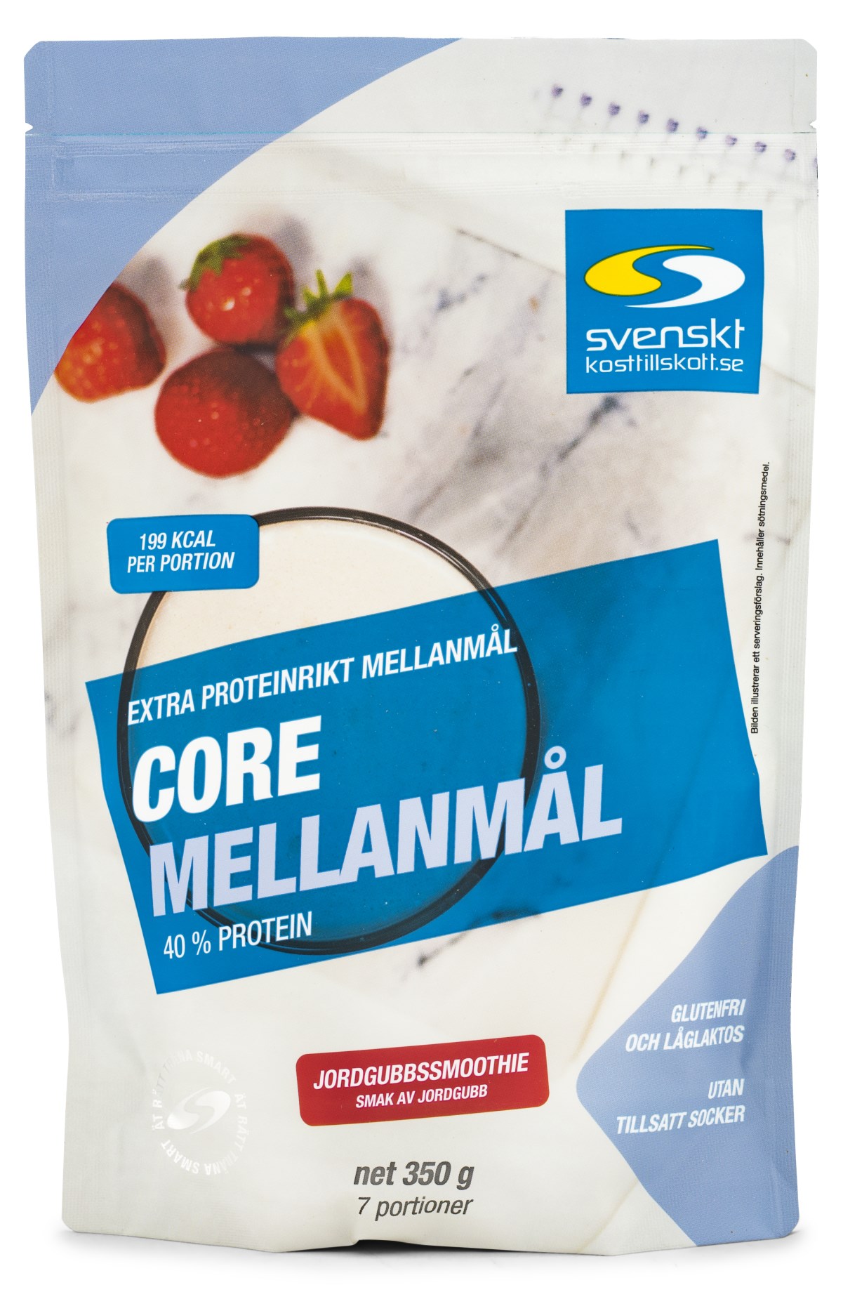 Core Mellanmål har ett extra högt proteininnehåll med 40 % protein, från vassle och helmjölksprotein som ger högvärdigt protein. Kolhydraterna kommer från havre som dessutom ger ett naturligt högt fiberinnehåll. Core Mellanmål är låglaktos och innehåller mindre än 0,1 gram laktos per 100 gram.