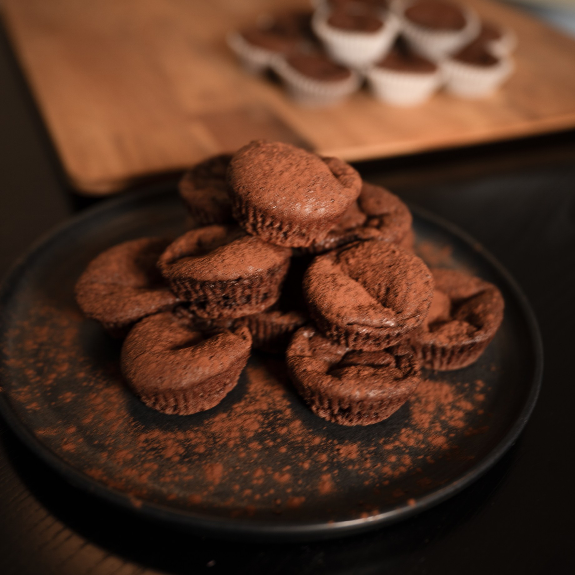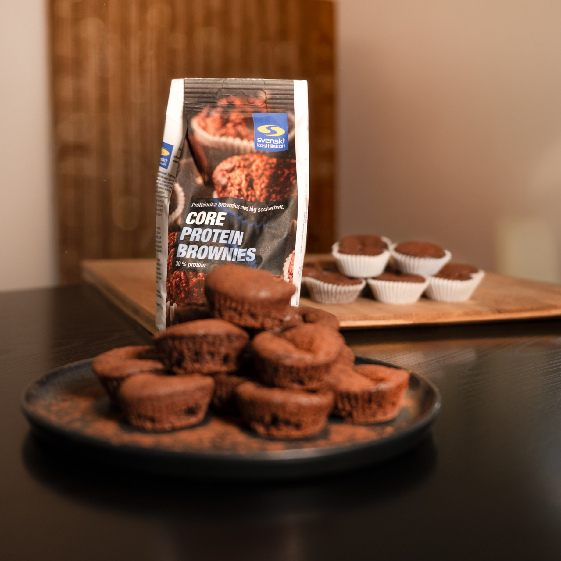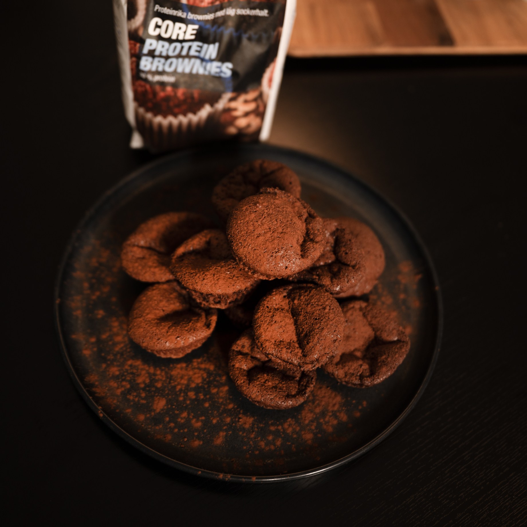 Färdigbakade proteinbrownies på ett fat, med en påse Core Protein Brownies bakmix i bakgrunden.