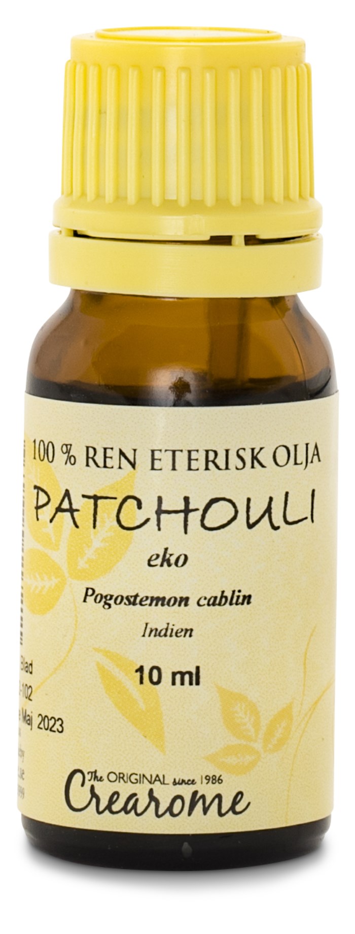 Patchouliolja utvinns ur bladen på växten med samma namn. Crearomes patachouli är ekologisk. Dess unika doft upplevs varm och jordig, vilket uppskattas i aromaterapi för en avslappnande effekt. Patchouliolja används även som doftessens i skönhetsprodukter.