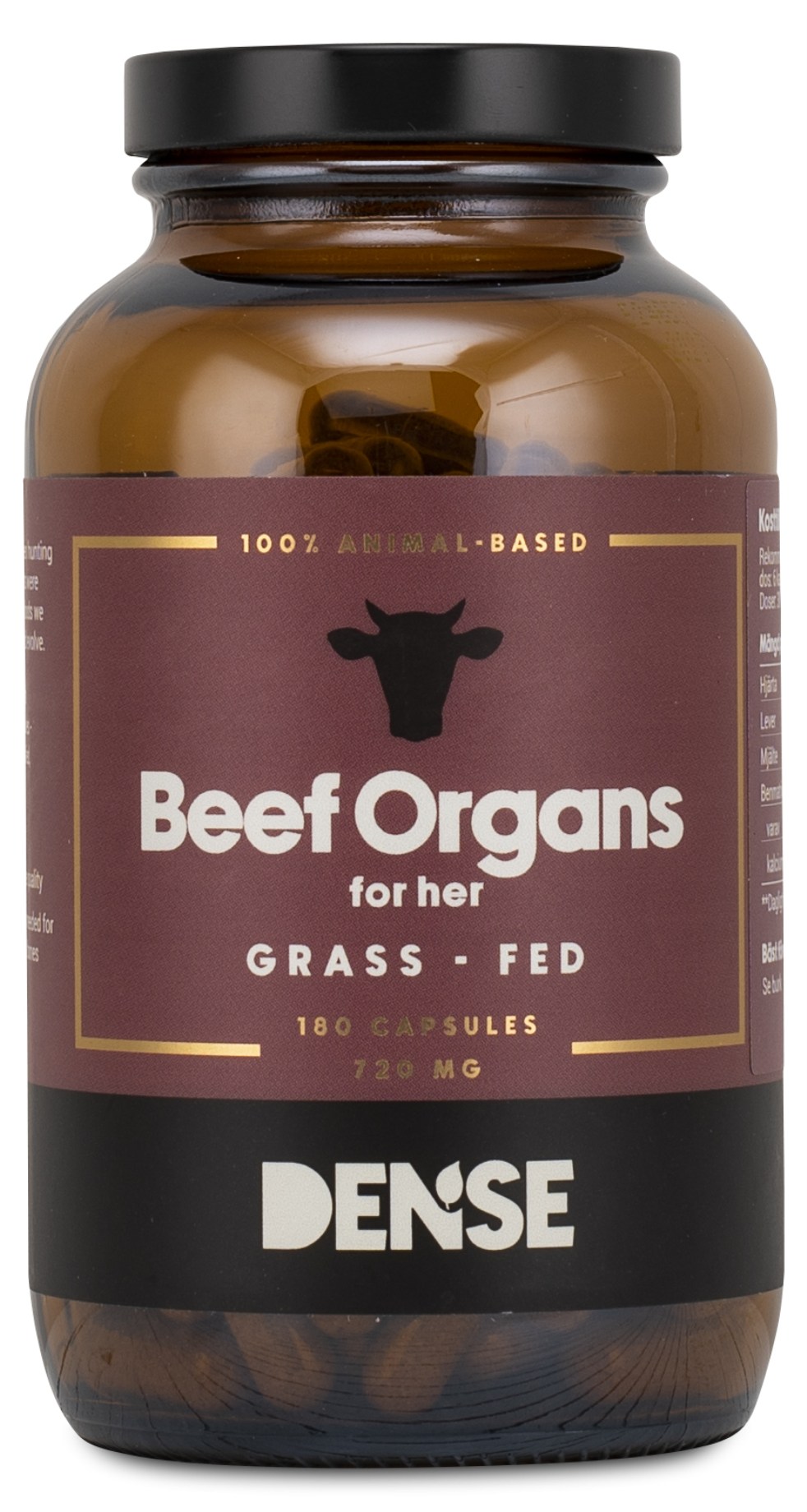 Speciellt framtaget för kvinnors behov, innehåller Dense Nötorgan for Her frystorkade organ från gräsbetande nötkreatur: hjärta, lever, mjälte och benmatrix. Hjärta och mjälte har en lång tradition inom olika matkulturer för energi och vitalitet. Lever är en naturlig källa till vitaminer och mineraler som kroppen lätt kan ta upp. Benmatrix innehåller en balanserad sammansättning av kalcium, fosfor och spårmineraler. Kapslarna är skonsamt frystorkade för att bevara råvarornas naturliga egenskaper och är helt fria från tillsatser.