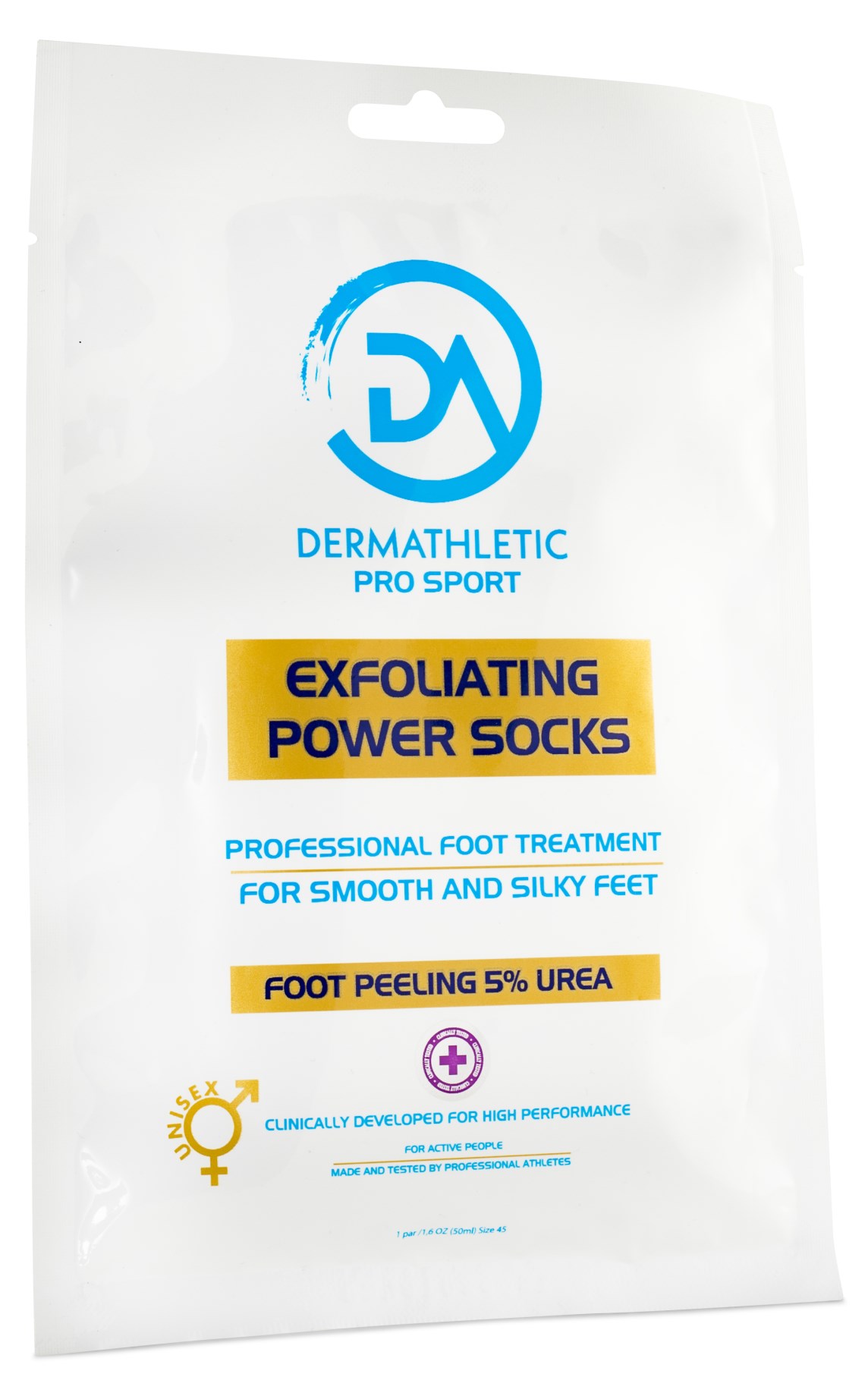 Dermathletic Exfoliating Power socks är framtagna ihop med elitidrottare inom olika sporter för att på bästa sätt ta hand om sina fötter. Hudförhårdnader uppkommer till följd av att huden under fötterna förtjockas när den utsätts för tryck och slitage och speciellt när man idrottar. Det kan även bli lättare att få skav och rodnader om de underliggande hudlagren blir ömma. Dessa exfolierande sockor avlägsnar död hud och gör fötterna mjuka.