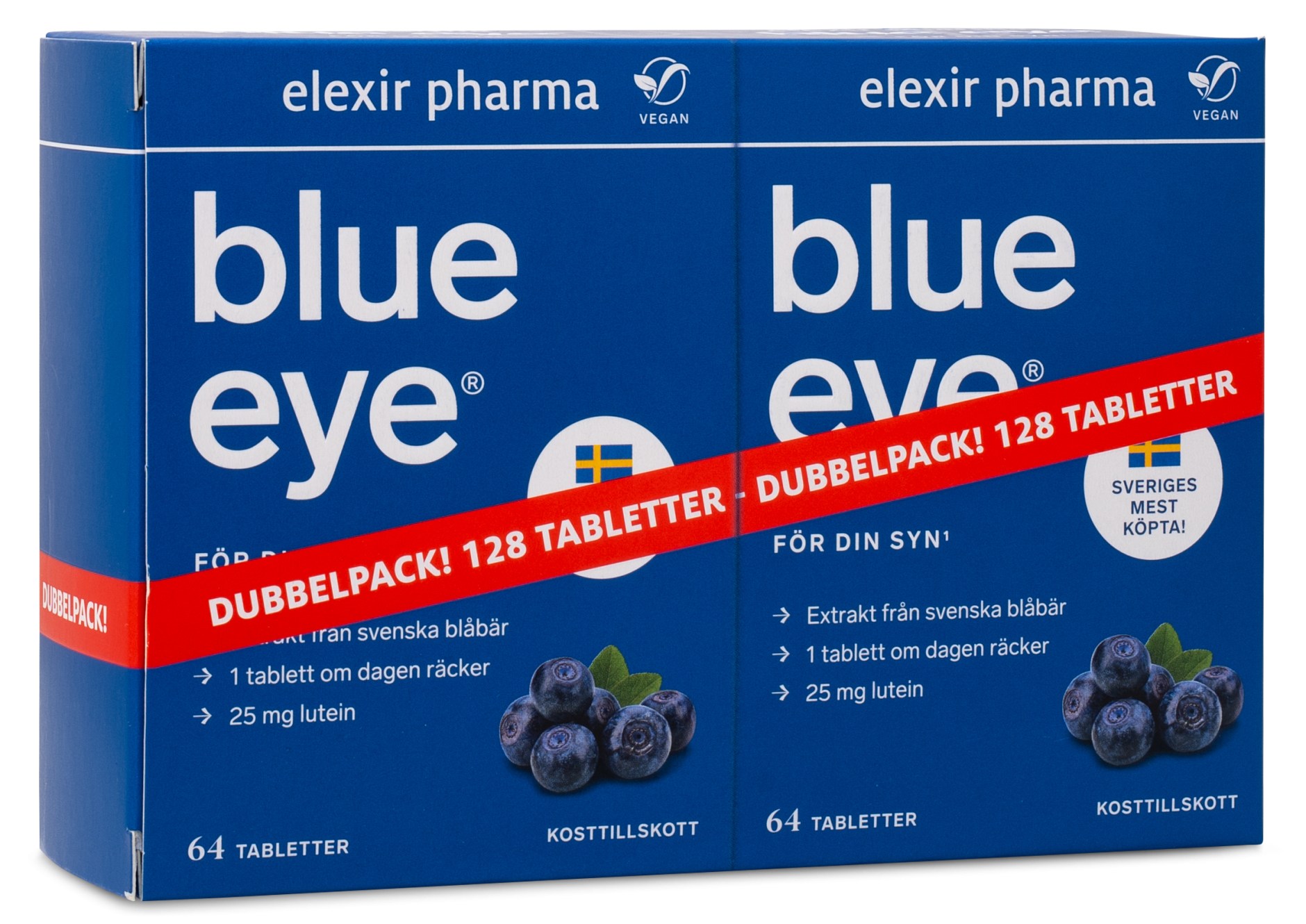 Elexir Pharma Blue Eye är tabletter berikade med blåbärsextrakt som naturligt är rika på lutein. Lutein är en näringsförening som finns i ögats näthinna, men kroppen kan inte producera lutein själv, vilket gör det nödvändigt att tillföra det genom kosten. För att ge extra mängd lutein, har även lutein från ringblomma tillsatts till produkten. Blue Eye är ett dagligt tillskott lämpligt för alla som vill säkerställa sitt intag av dessa näringsämnen, särskilt för personer över 50 år. Rekommenderad dos är en tablett dagligen. Elexir Pharma Blue Eye har vunnit pris som Årets seniorprodukt 2017 av Swedish Health Awards.