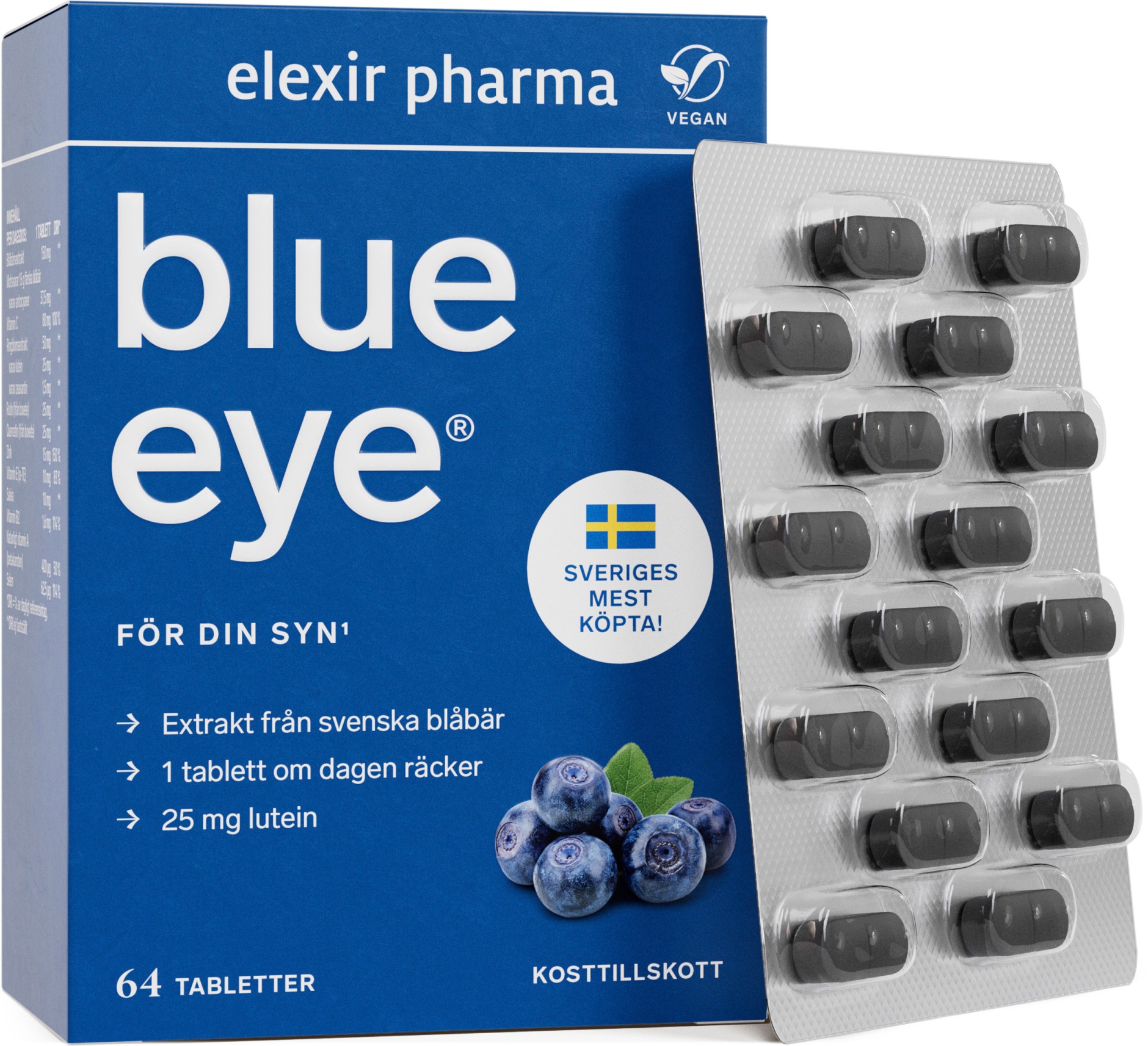 Elexir Pharma Blue Eye är tabletter berikade med blåbärsextrakt som naturligt är rika på lutein. Lutein är en näringsförening som finns i ögats näthinna, men kroppen kan inte producera lutein själv, vilket gör det nödvändigt att tillföra det genom kosten. För att ge extra mängd lutein, har även lutein från ringblomma tillsatts till produkten. Blue Eye är ett dagligt tillskott lämpligt för alla som vill säkerställa sitt intag av dessa näringsämnen, särskilt för personer över 50 år. Rekommenderad dos är en tablett dagligen. Elexir Pharma Blue Eye har vunnit pris som Årets seniorprodukt 2017 av Swedish Health Awards.