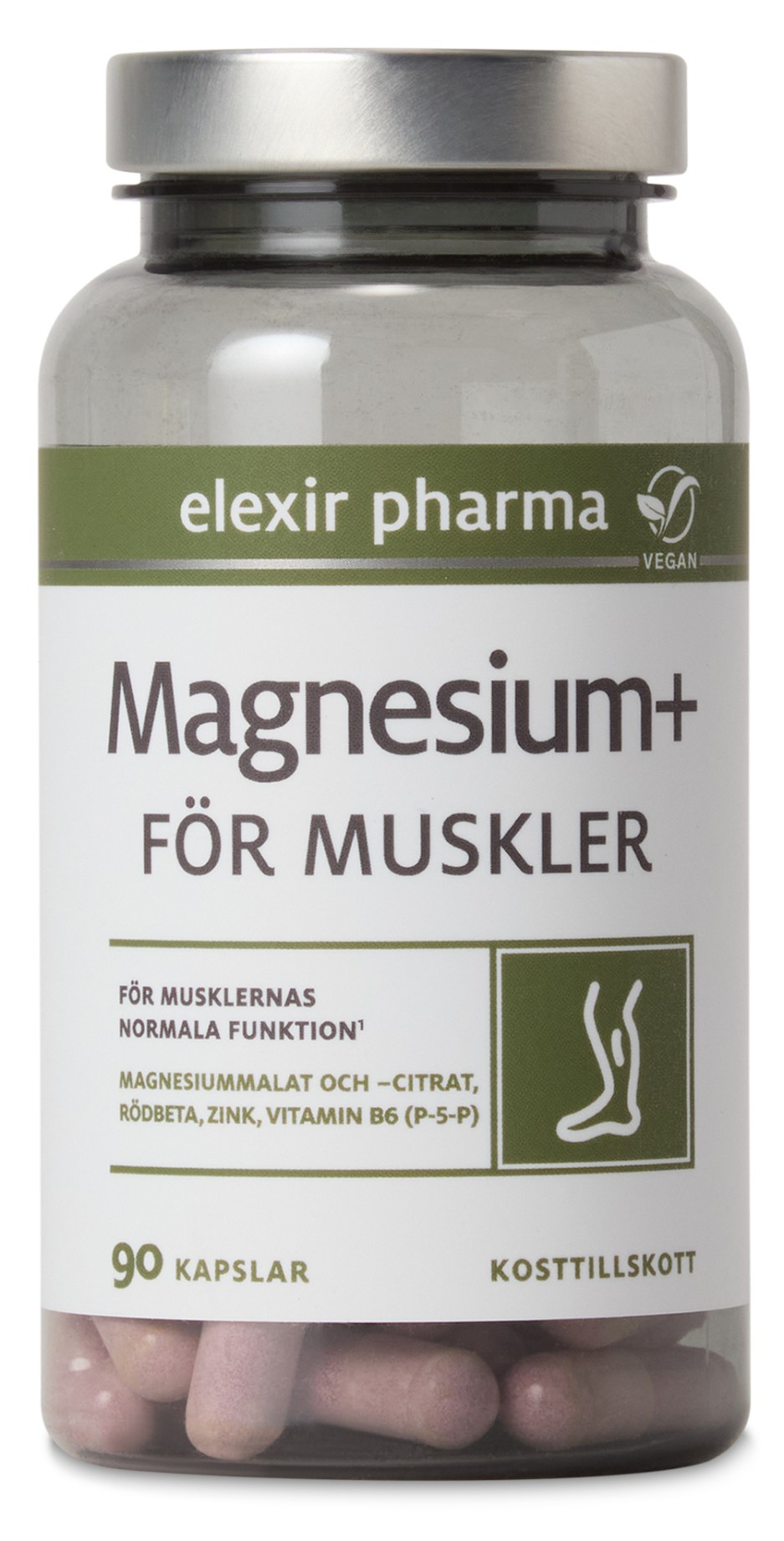 Elexir Pharma Magnesium+ För muskler innehåller de två formerna magnesiumcitrat och magnesiummalat – två organiska former av magnesium med hög biotillgänglighet. Här kombineras de med zink, vitamin B6 i den aktiva formen P-5-P samt rödbetsextrakt. Både vitamin B6 och magnesium bidrar till att minska trötthet och utmattning, medan rödbetsextrakt är tillsatt för sin höga nivå av nitrater. Brist på magnesium kan bland annat leda till muskelkramper.