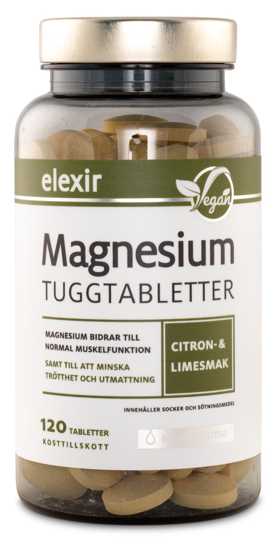 Elexir Pharma Magnesium Tuggtablett är ett bra alternativ för dig som har svårt att svälja kapslar eller vanliga tabletter och istället föredrar magnesium i tuggform. Passar även för barn och ungdomar. Magnesium bidrar till normal muskelfunktion och till nervsystemets normala funktion. Tabletterna har en frisk smak av citron och lime.