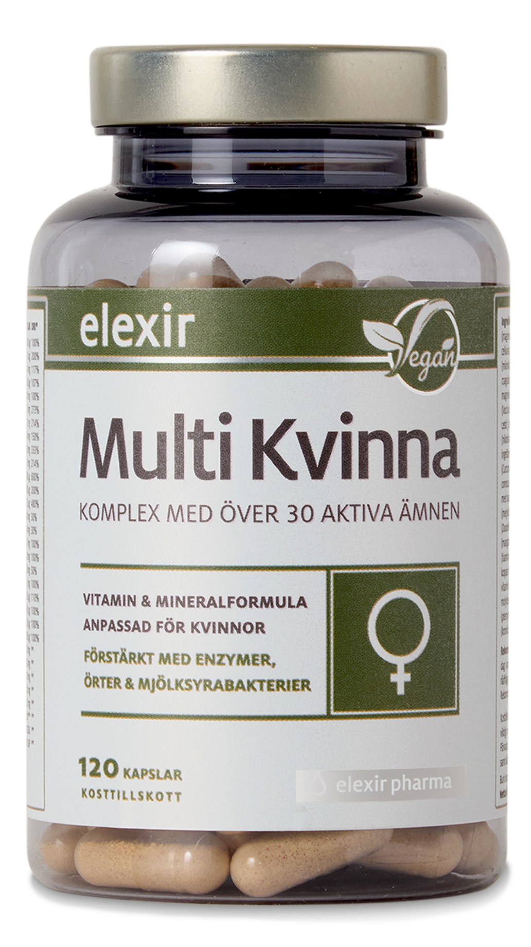 I Elexir Pharma Multi Kvinna hittar du en heltäckande blandning av vitaminer, mineraler, matsmältningsenzymer och mjölksyrabakterier i ett och samma tillskott. Det innehåller över 30 aktiva ämnen i en unik kombination och är ett perfekt alternativ för dig som inte vill ta flera olika tillskott. Multi Kvinna innehåller både folsyra och järn – två ämnen som är extra viktiga för kvinnor. Järn bidrar till normal blodbildning av röda blodkroppar och till normal syretransport i kroppen.