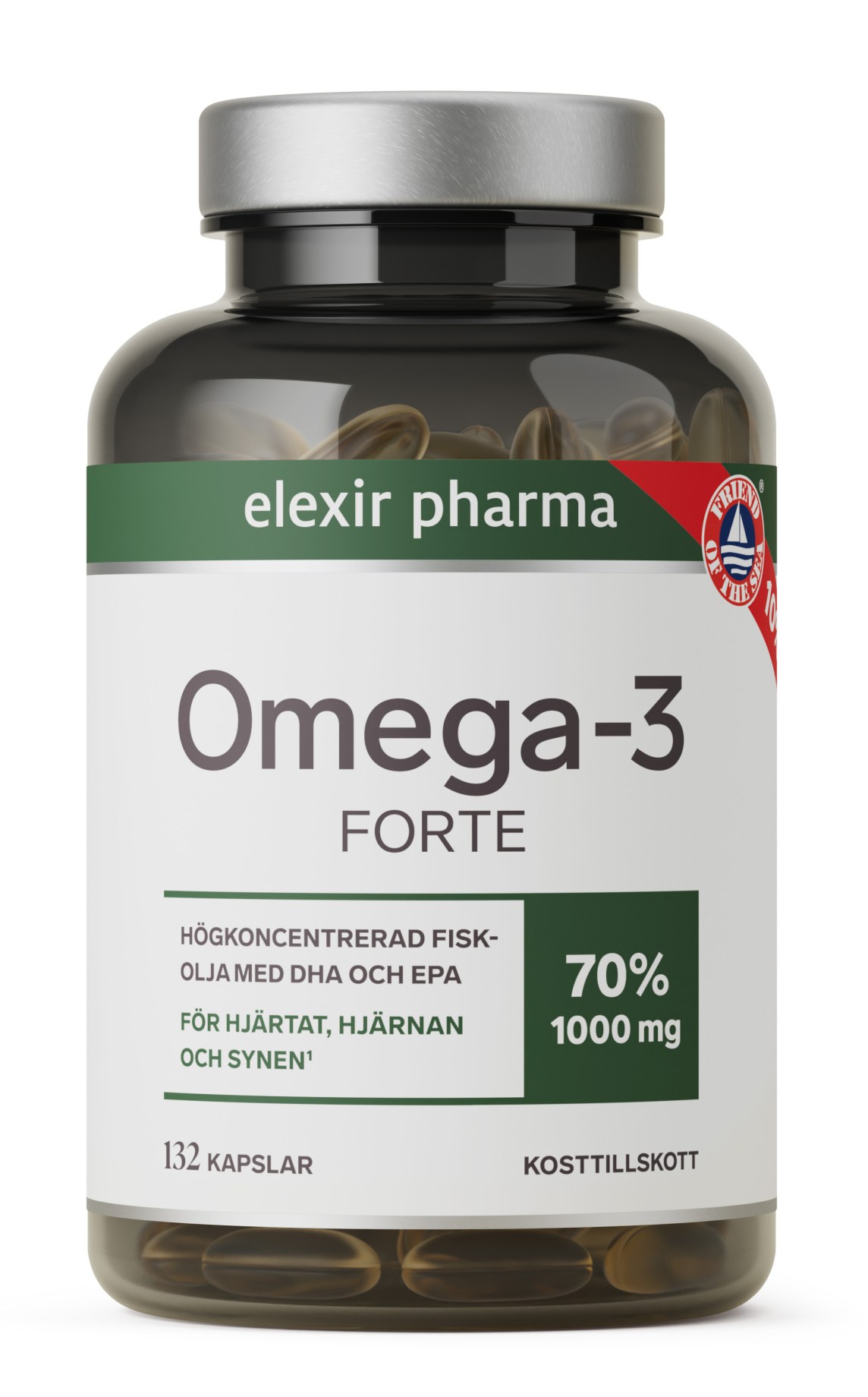 Elexir Pharma Omega-3 Forte är en högdoserad fiskolja av högsta kvalitet där varje kapsel förser dig med hela 70 % omega-3, utvunnet från hållbara bestånd av anjovis, sill och makrill utanför Sydamerikas kust. Det höga innehållet av omega-3 fettsyror gör att du bara behöver inta en kapsel dagligen för att tillgodose dig det rekommenderade dagliga intaget av omega-3. Elexir Pharma Omega-3 Forte har ett högt innehåll av omega-3 fettsyrorna EPA och DHA, triglyceridform, som bidrar till hjärtats normal funktion och DHA bidrar dessutom till bibehållandet av normal hjärnfunktion samt bibehållandet av normal syn.