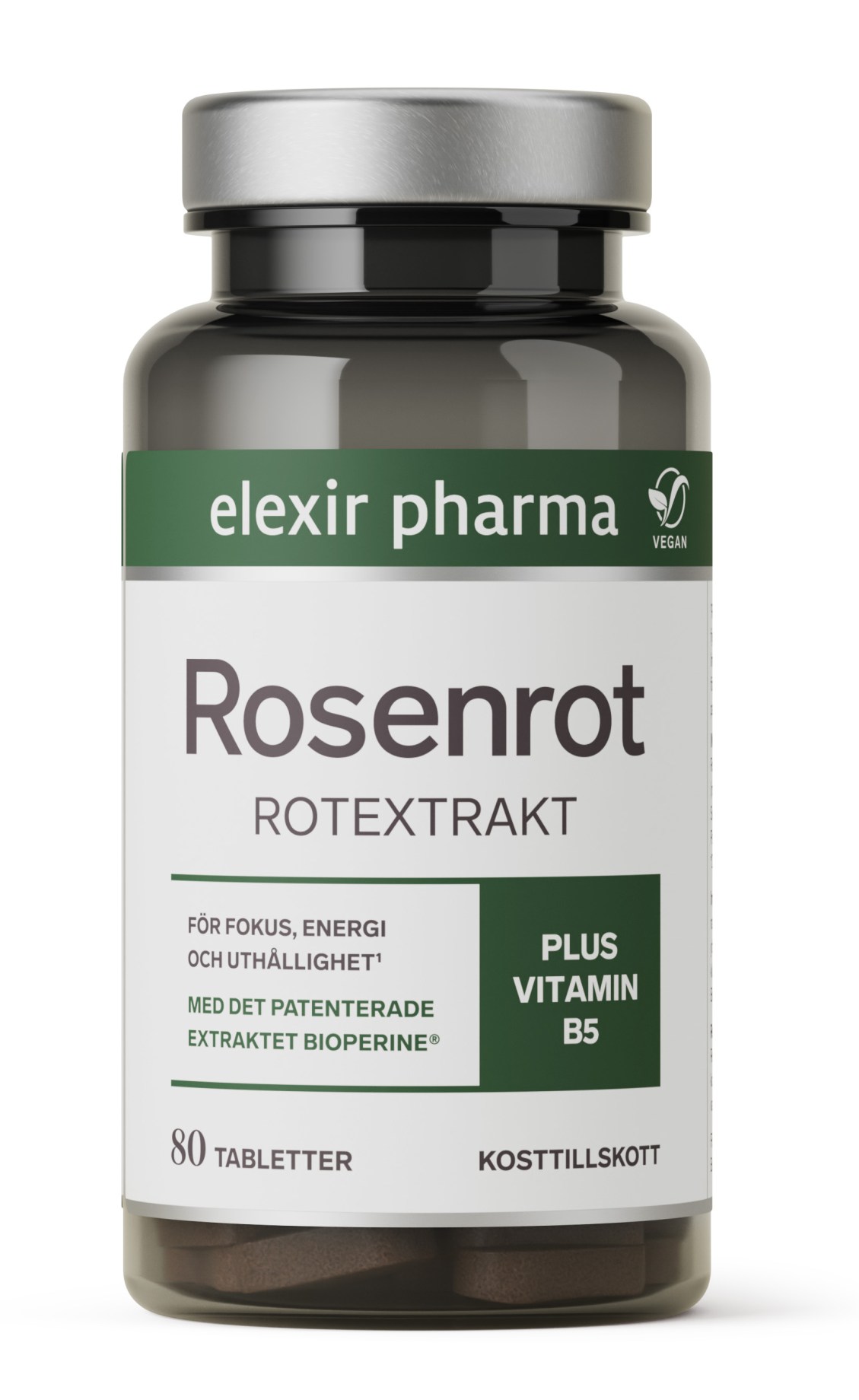 I perioder av stress eller när du känner dig trött kan du prova Elexir Pharma Rosenrot. Tabletterna innehåller extrakt från adaptogenen rosenrot som ofta används vid trötthet och fysisk utmattning. Tabletterna innehåller även vitamin B5 som hjälper till att upprätthålla en normal prestation och minska trötthet. För att öka upptaget är tabletterna även kompletterade med Bioperin® som är en patenterad form av svartpepparextrakt. Testa Elexir Pharma Rosenrot när du behöver hjälp med uthålligheten och att bibehålla fokus.