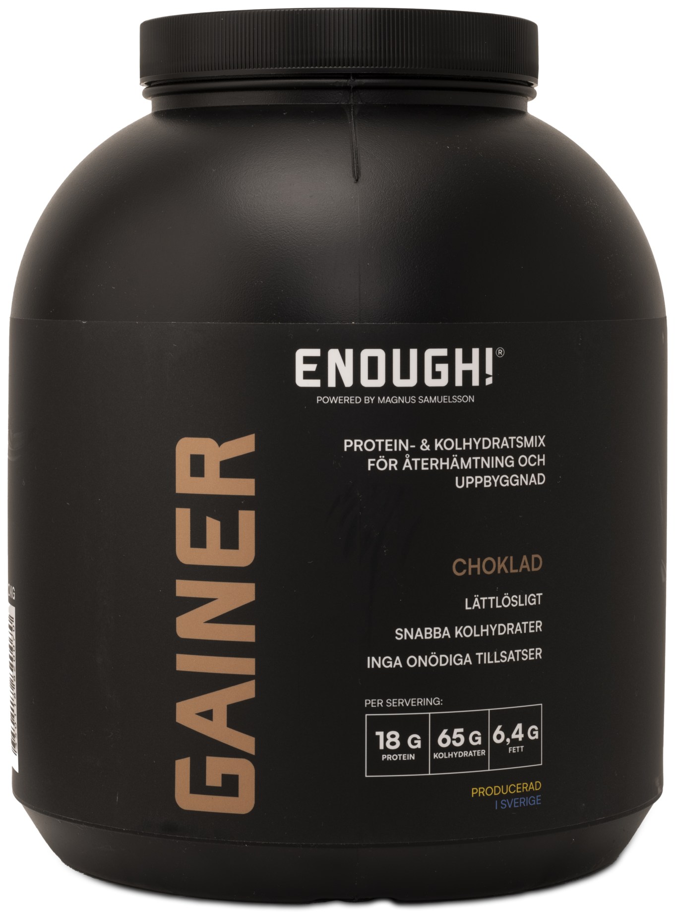 Enough Gainer är ett tillskott för dig som vill öka i muskelmassa, förbättra återhämtningen och gå upp i vikt på ett hållbart sätt. Denna gainer innehåller en kombination av snabba kolhydrater och svenskt, högkvalitativt vassleprotein som ger kroppen snabb energi och näring, perfekt efter träning eller som mellanmål när du behöver energi och extra påfyllning. Enough Gainer är framtagen tillsammans med nutritionister, läkare och svenska bönder – med fokus på funktion, hållbarhet och resultat utan kompromisser. Denna gainer passar dig som tränar hårt och behöver ett snabbt, enkelt sätt att fylla på med energi och kalorier för att stötta återhämtning och uppbyggnad, samt dig som har svårt att få i dig tillräckligt med kalorier under dagen.