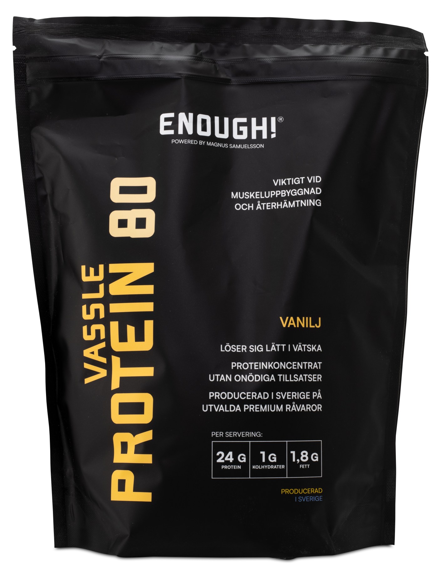 Magnus Samuelssons proteinpulver från Enough är ett måste för dig som tränar och värdesätter rena produkter. Oavsett vad syftet med din träning är så är ett tillräckligt proteinintag viktigt för att ge din kropp de bästa förutsättningarna för att återhämta sig och kunna bygga upp sig själv ännu starkare. Enough Proteinpulver innehåller alla de essentiella aminosyror som är viktiga vid muskeluppbyggnad, samt ger en bra mättnadskänsla. Tillskottet är gjort på svensk, spårbar råvara och innehåller endast vassleprotein, aromer och sötning av stevia. Med hela 23 gram protein per portion.