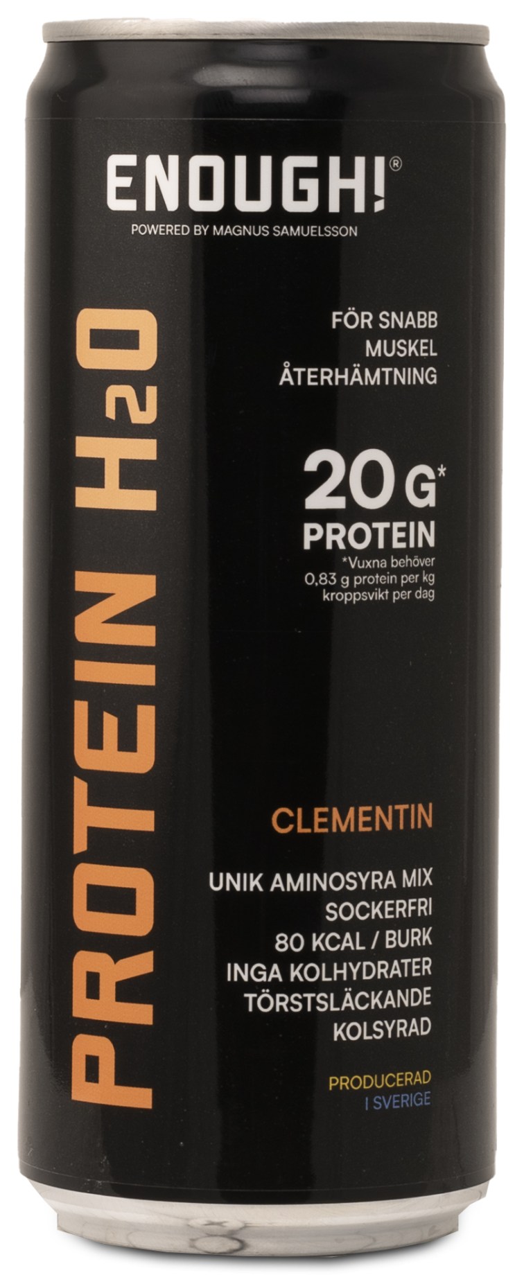 Magnus Samuelssons Proteinvatten från Enough är en lågkaloriprodukt som innehåller hela 20 gram protein. Med de essentiella aminosyrorna leucin, valin, isoleucin, treonin, lysin, fenylalanin, metionin och histidin. Essentiella aminosyror är sådana som kroppen inte kan tillverka själv. Utöver dessa innehåller det även glutamin, glycin, taurin, citrullin och alanin. Proteinvattnet är perfekt att dricka för personer som vill bränna fett eller för de som fokuserar på muskelutveckling. Producerat i Sverige.