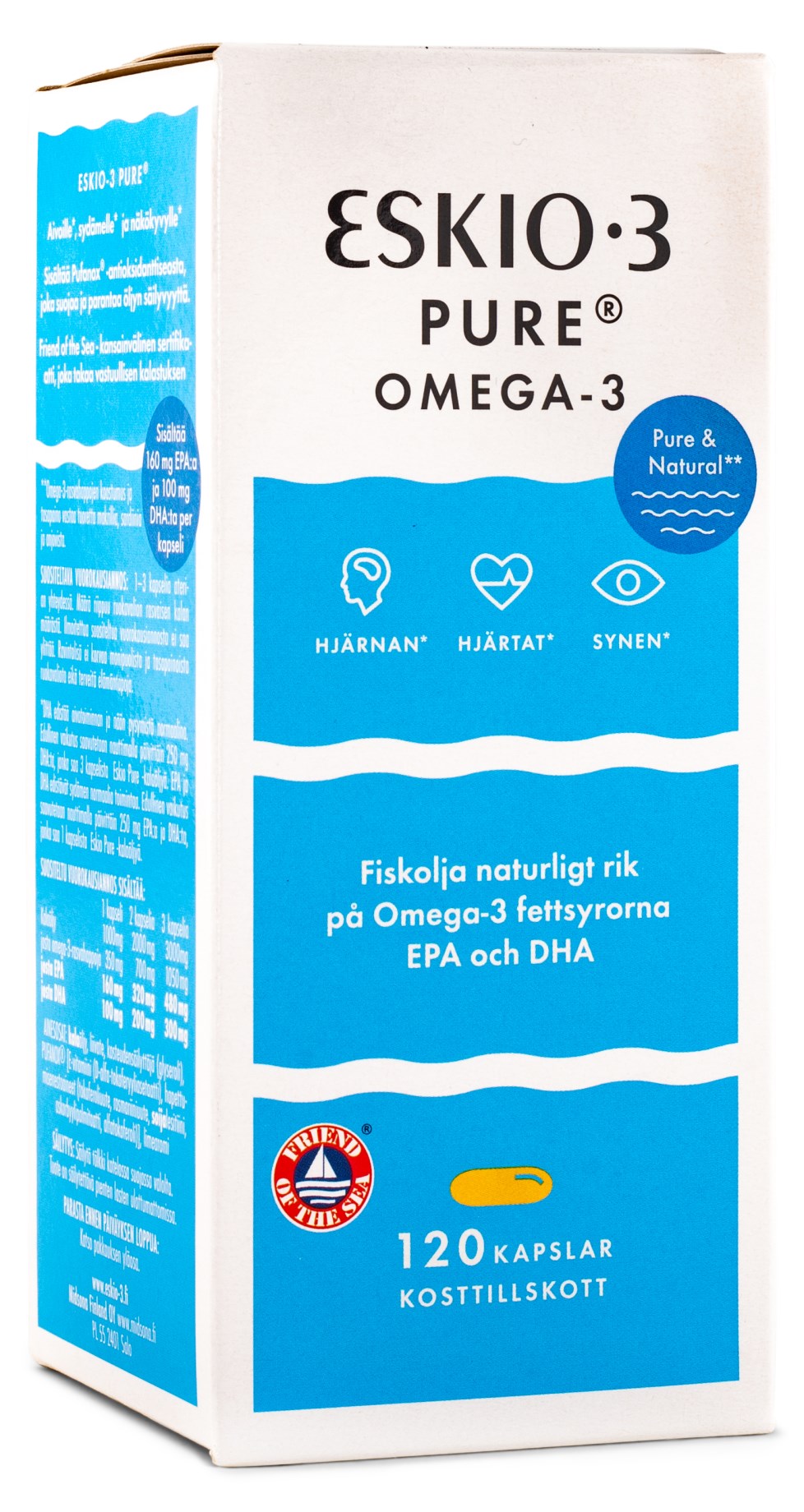 Forskarna är idag eniga om att fet fisk är viktigt för hälsan. Därför innehåller Eskio-3 Pure bara ren och omodifierad fiskolja. I Eskio-3 Pure finns fiskens ursprungliga mångfald av omega-3-fettsyror bevarade i sin naturliga form.