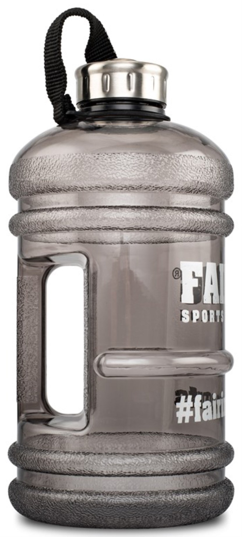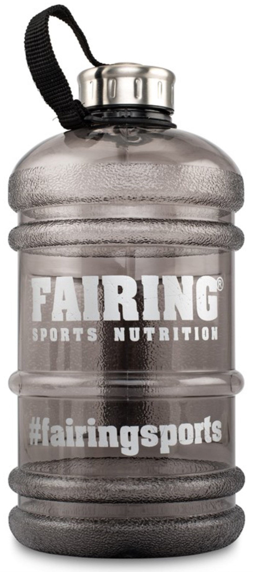 Ibland räcker det inte med en vanlig liten vattenflaska. När behovet av mer vätska finns, passar denna vattendunk från Fairing utmärkt! Plastdunken rymmer hela 2,2 liter vätska, är fri från BPA och har ett greppvänligt handtag som gör den enkel att manövrera. Du kan använda den som påfyllnad eller dricka direkt ur. Den praktiska skruvkorken sitter säkert och är fäst i ett band runt flaskhalsen för att den inte ska försvinna. Stor logga på fronten och transparent svart färg.