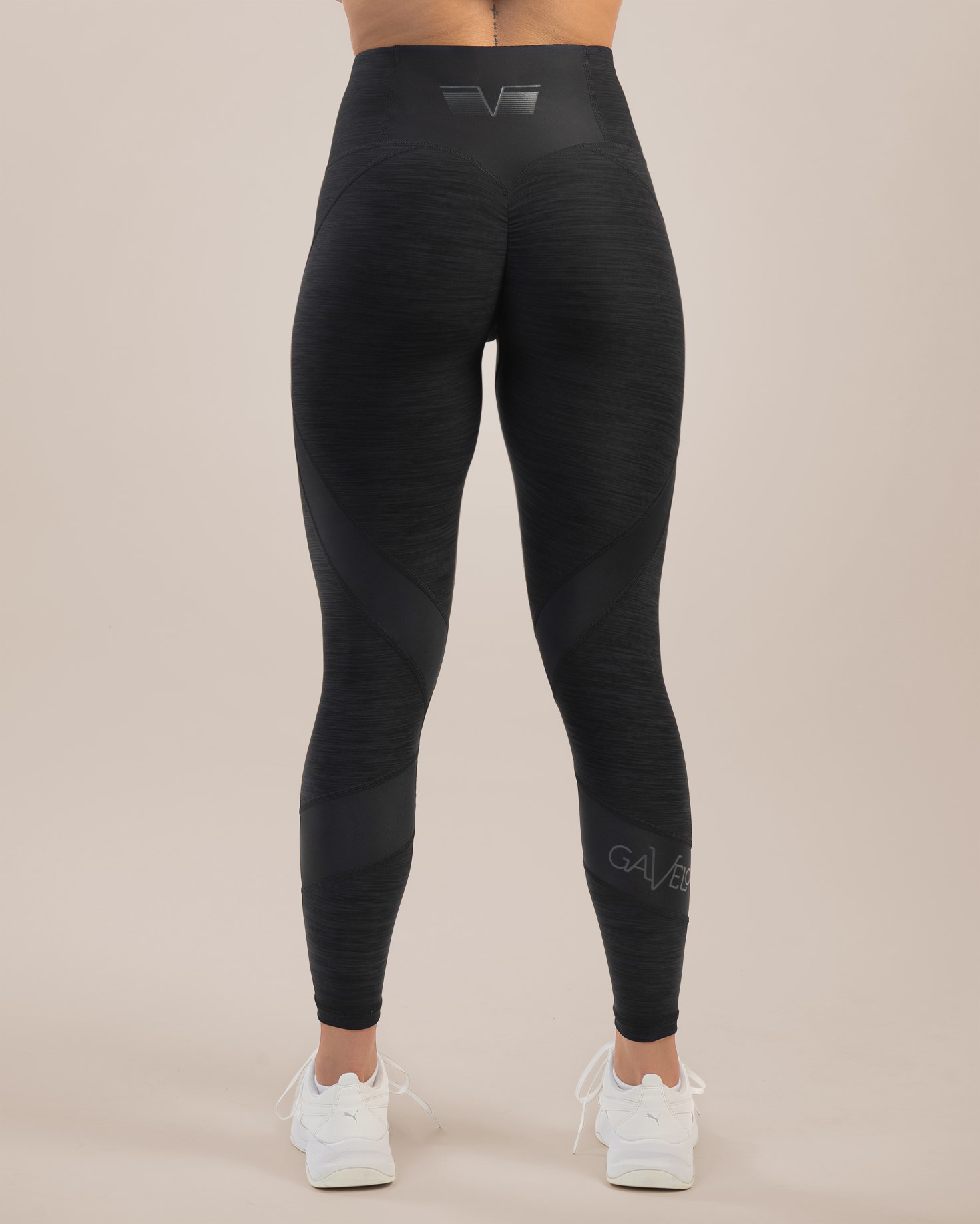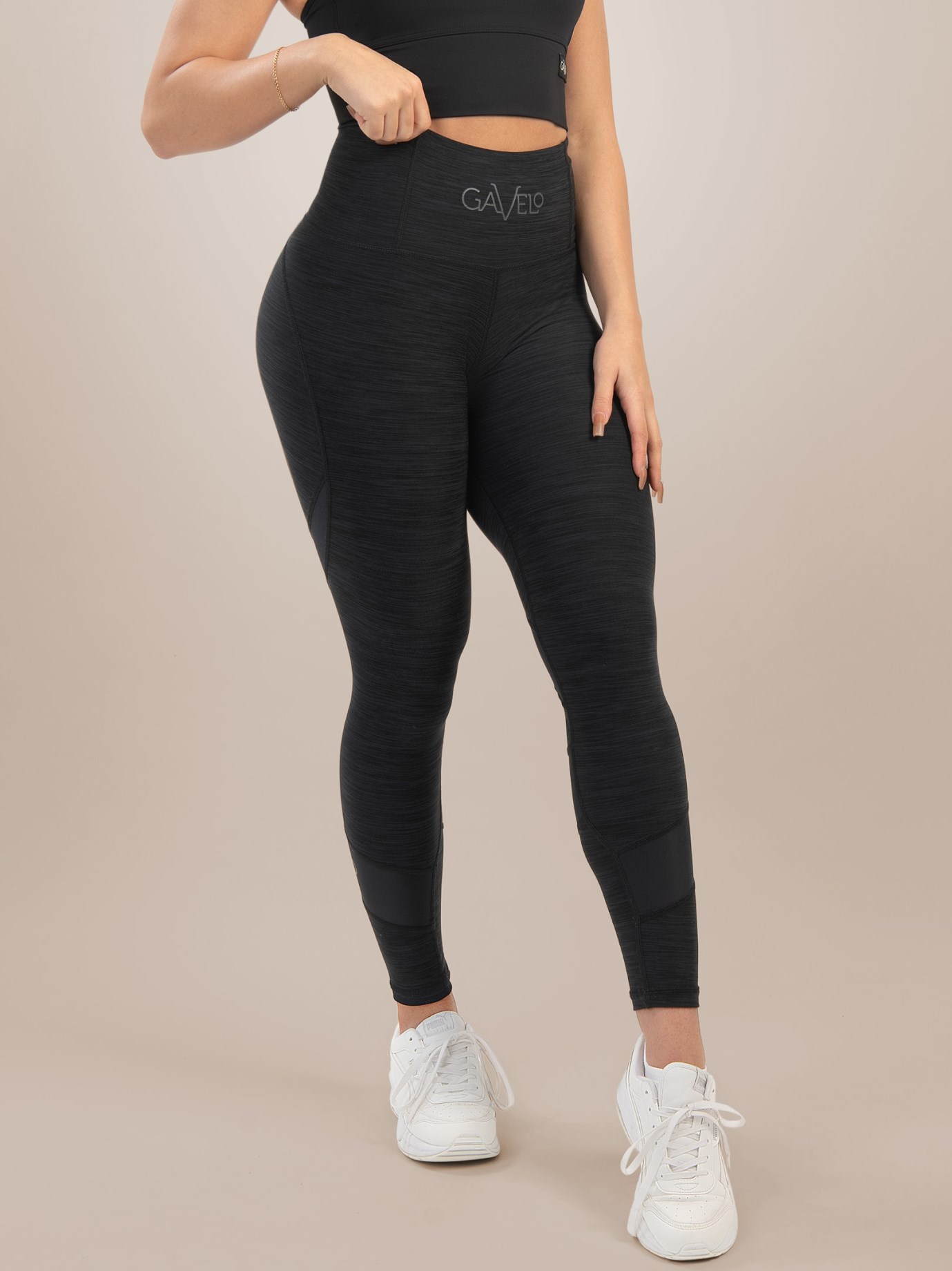Gavelo Swirl Tights är ett par mjuka, följsamma och tunnare tights som passar till all typ av träning. De är designade med en hög midja med ett mönster som går ner i v-form baktill, vilket bidrar till en framhävande och smickrande siluett. En svag scrunch baktill och melerat tyg med paneler längs sidan av benen. Framhäv dina former med dessa tights!