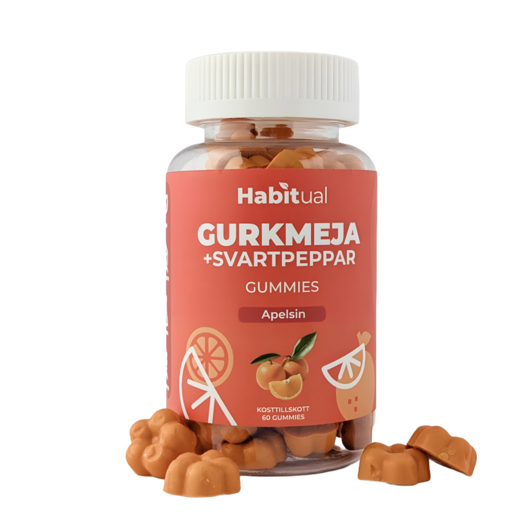 Habitual Gurkmeja Gummies + Svartpeppar är fruktiga gummies med gurkmeja (curcumin), ingefära och svartpeppar med fräsch apelsinsmak och utan bitter eftersmak. Naturligt, veganskt och glutenfritt. En portion ger 300 mg gurkmeja, enkelt och gott för dig som vill ha ett praktiskt alternativ till kapslar och pulver.
