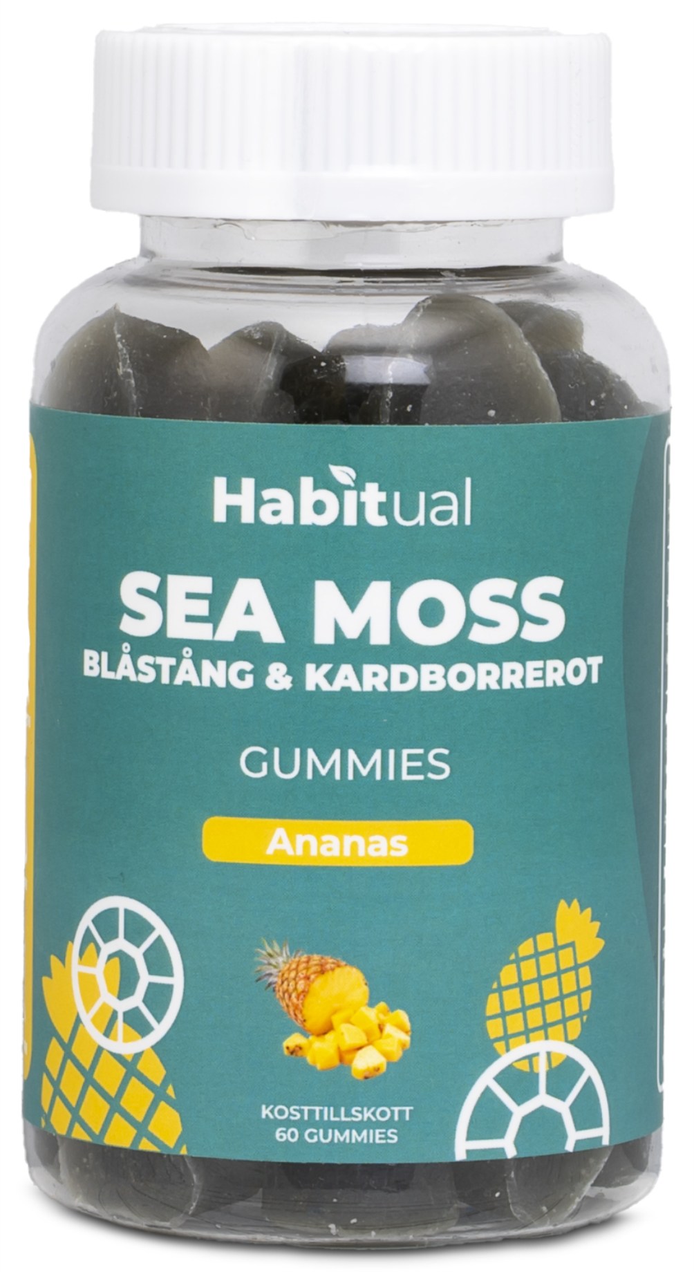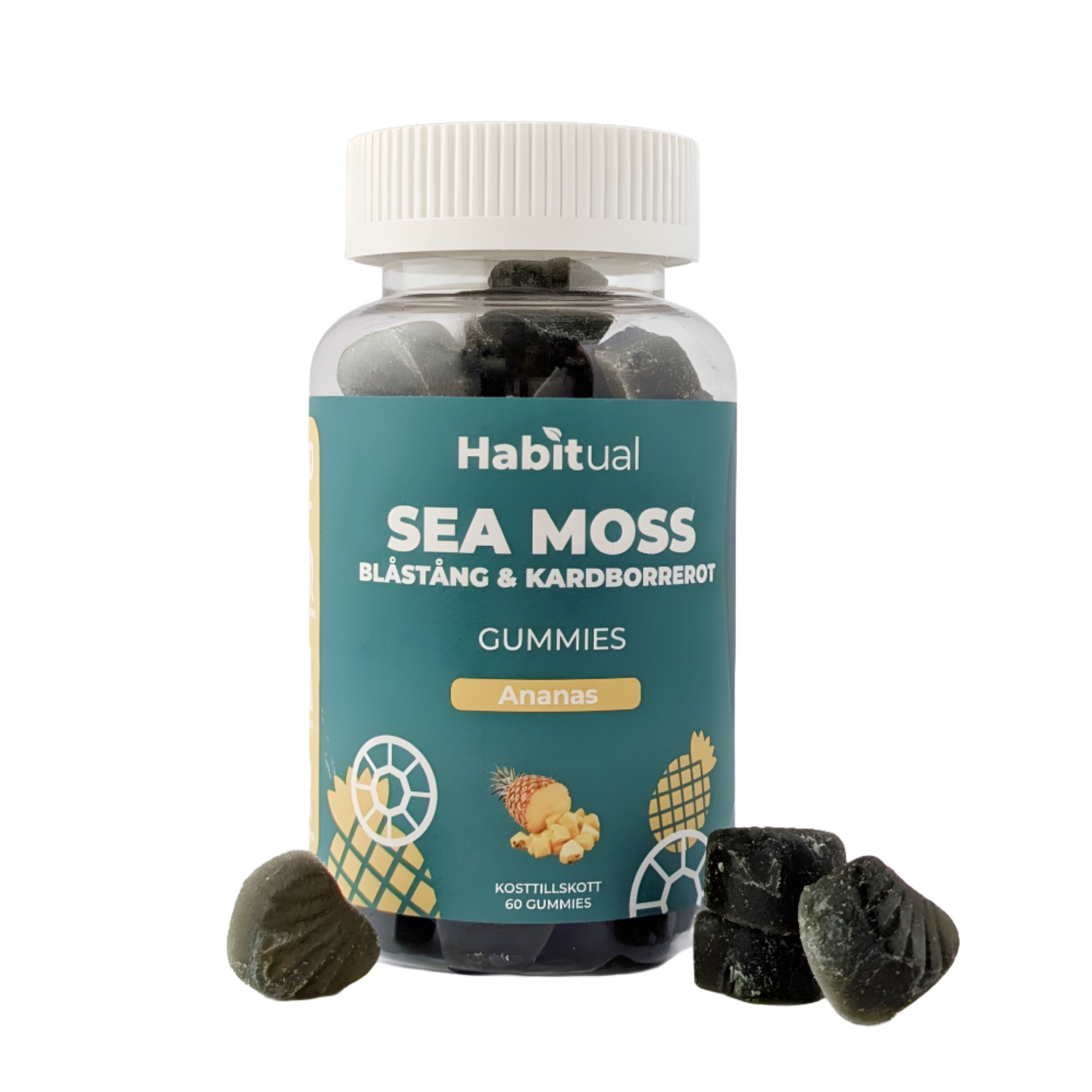 Habitual Sea Moss Gummies är gummies med ren irländsk mossa, blåstång och kardborrerot. Ett smidigt sätt att få i sig marina ingredienser och växtextrakt i vardagen. Med god tropisk smak av ananas, helt utan havssmak. Enkla att ta, oavsett om du är hemma, på språng eller efter träningen. En dagsdos på två gummies ger 1000 mg irländsk mossa, 1000 mg blåstång och 250 mg kardborrerot.