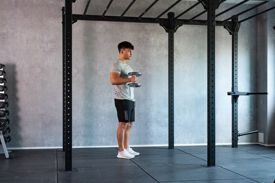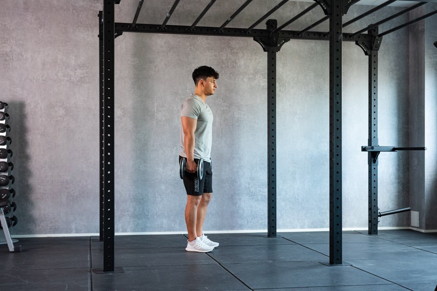 1. Greppa hantlarna med händerna axelbrett isär och handflatorna pekandes in mot kroppen.