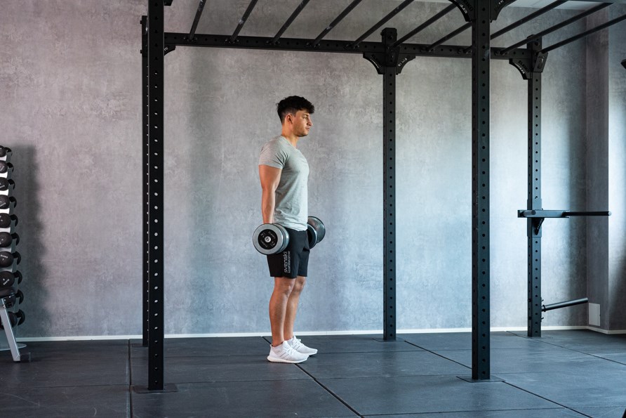 1. Greppa hantlarna med händerna axelbrett isär och ställ dig stadigt med fötterna.