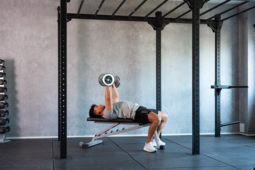 1. Greppa hantlarna och lägg dig på rygg på bänken med fötterna i golvet.