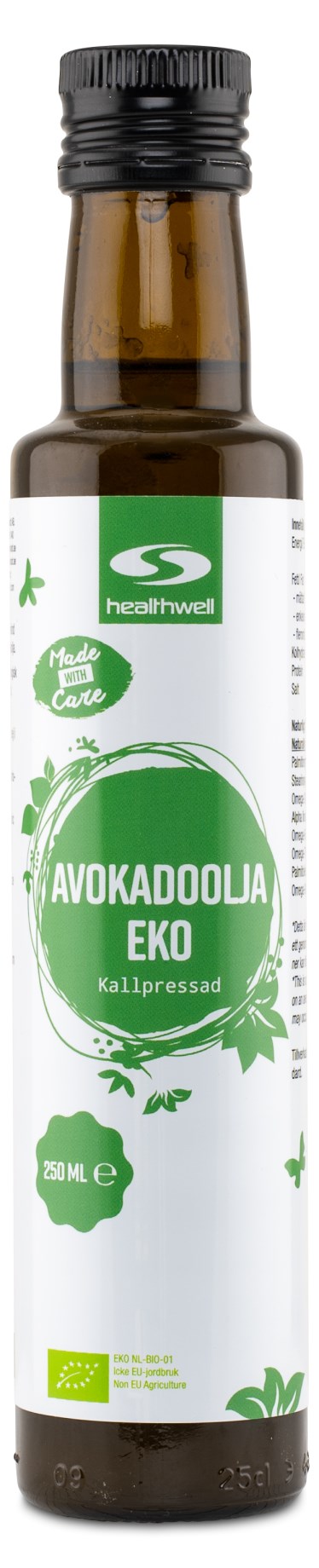 Healthwell Avokadoolja EKO kommer från avokador (Persea gratissima) som odlas ekologiskt i Kenya. Avokadon kallpressas vilket bevarar avokadons viktiga näringsämnen till den slutgiltiga produkten. Oljan förpackas i en mörk glasflaska för att hålla den fräsch längre och motverkar härskning.