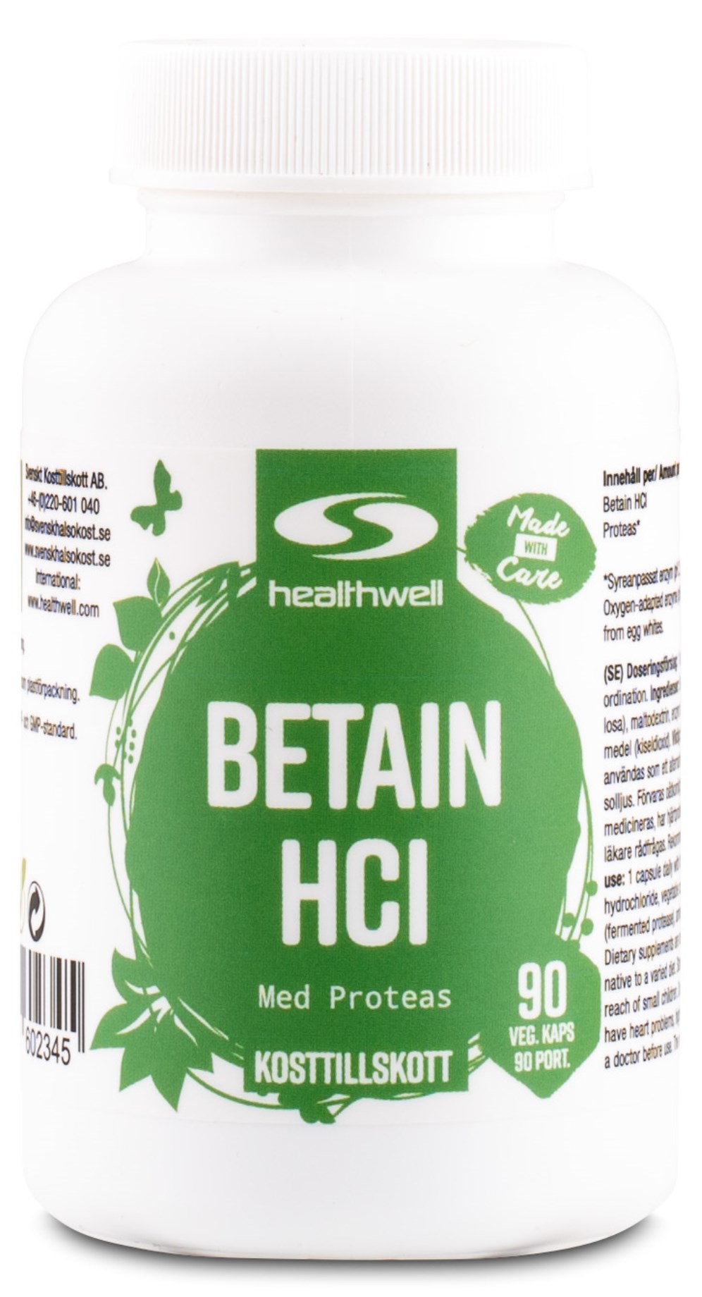 Betainhydroklorid (Betain HCL) är en kombination av betain, en aminosyra, och hydroklorid, ett salt av saltsyra som bidrar till surheten i magsyran. Det främjar produktionen av saltsyra i magen och underlättar matsmältningen. Healthwell Betain HCL är berikad med proteas, ett enzym som fungerar optimalt i en sur miljö (pH 2,5-3,5) och hjälper till att bryta ner proteiner i magen. Varje kapsel innehåller 60 mg proteas, vilket motsvarar nedbrytningen av 128 g koagulerat protein från äggvita.